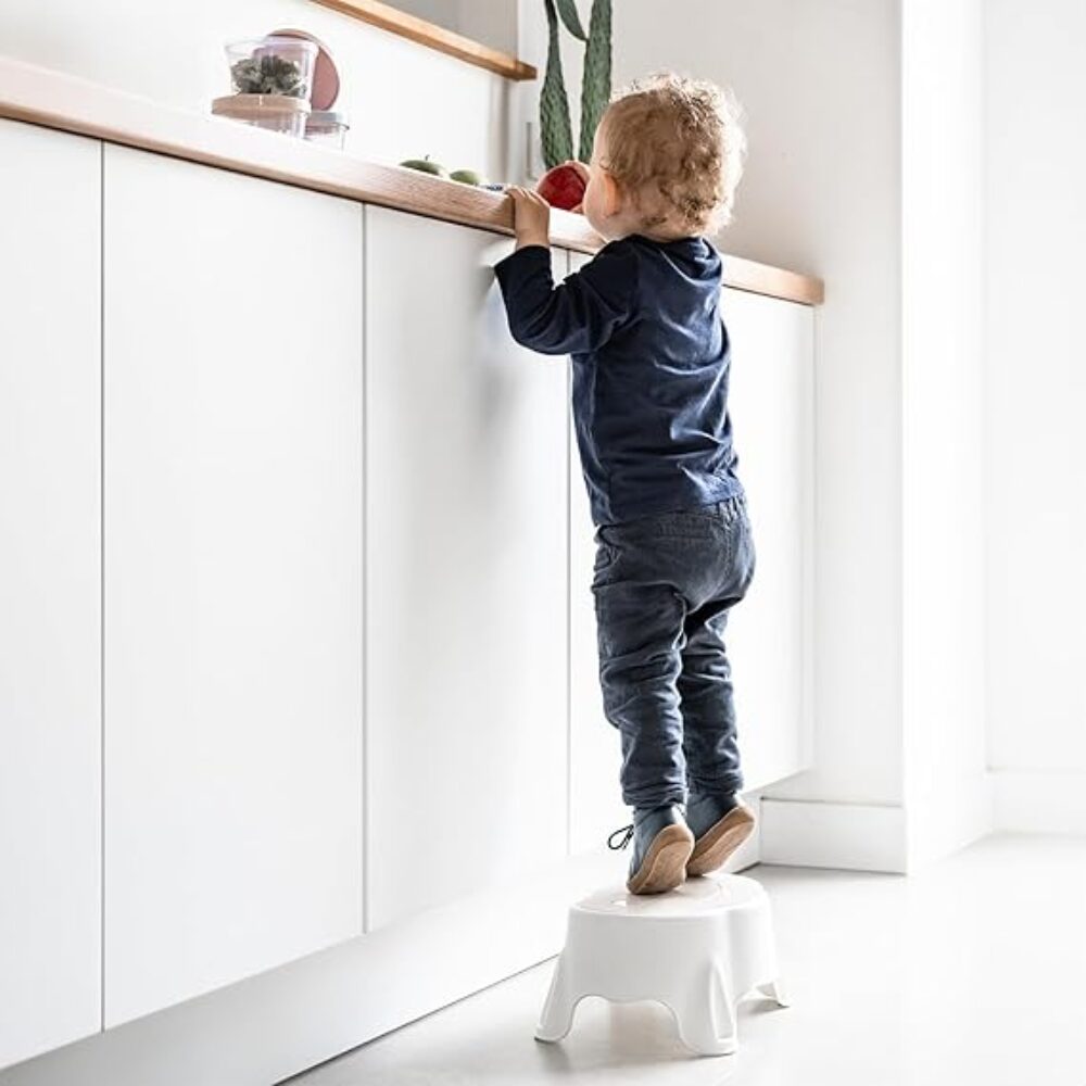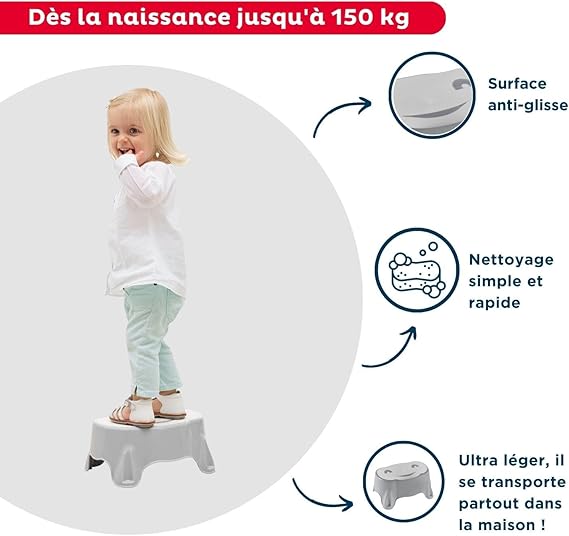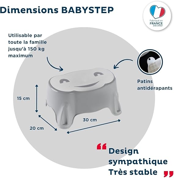 - Confiança: O pé BABYSTEP é muito estável graças à sua superfície e patins antiderrapantes. Pode suportar até 150 kg, o que também permite que os adultos usem com segurança.