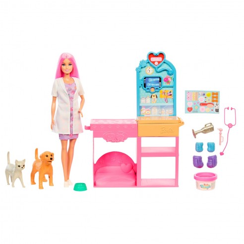Esta boneca da linha Barbie “Tu Podes Ser”, permite às crianças imaginar‑se como Veterinária, numa clínica completa com mesa de exame, acessórios veterinários e dois animaizinhos de estimação. A Barbie aparece com cabelo rosa, bata branca, e equipamentos para tratar os pequenos pacientes, incluindo uma função de “gesso rápido” para reparar patas partidas.