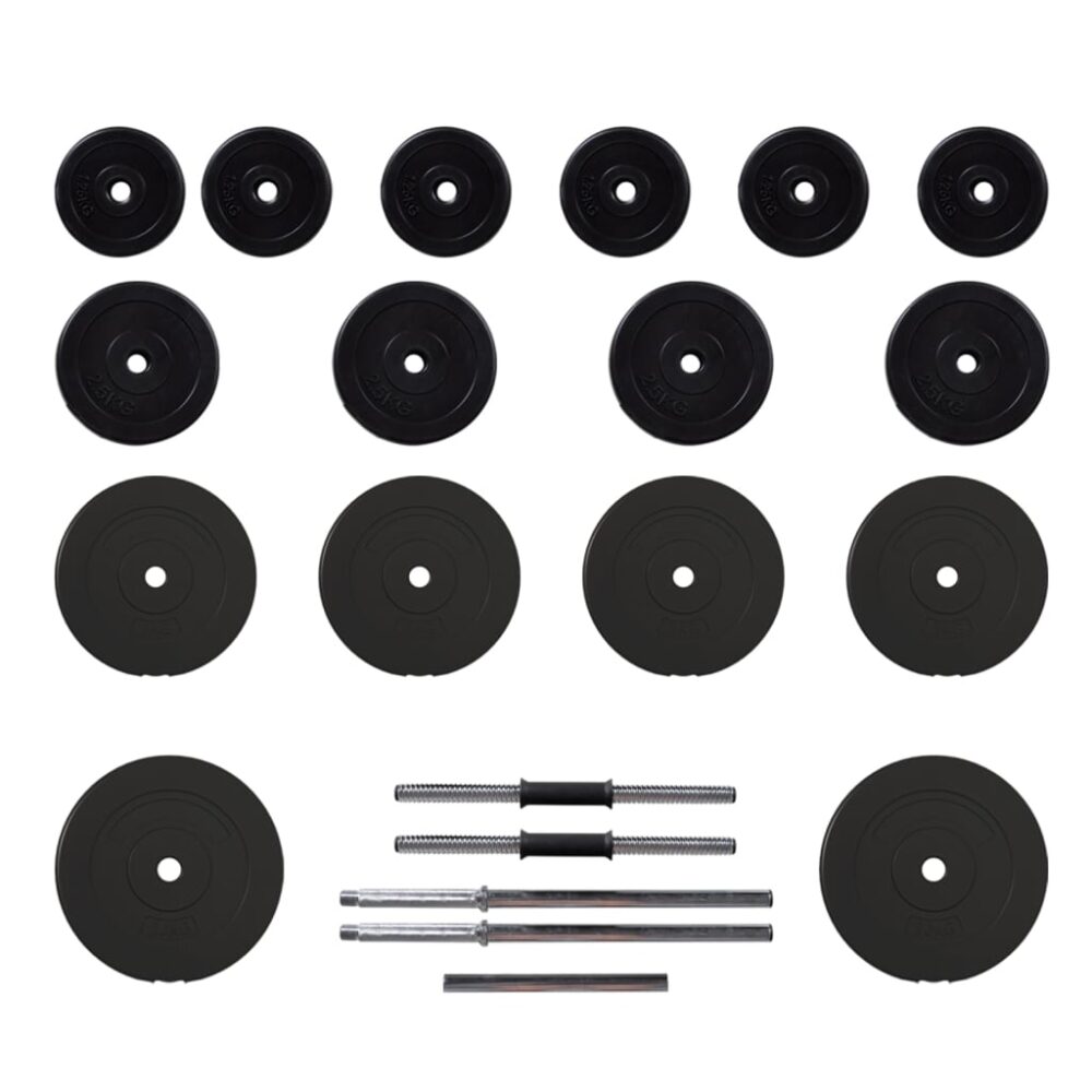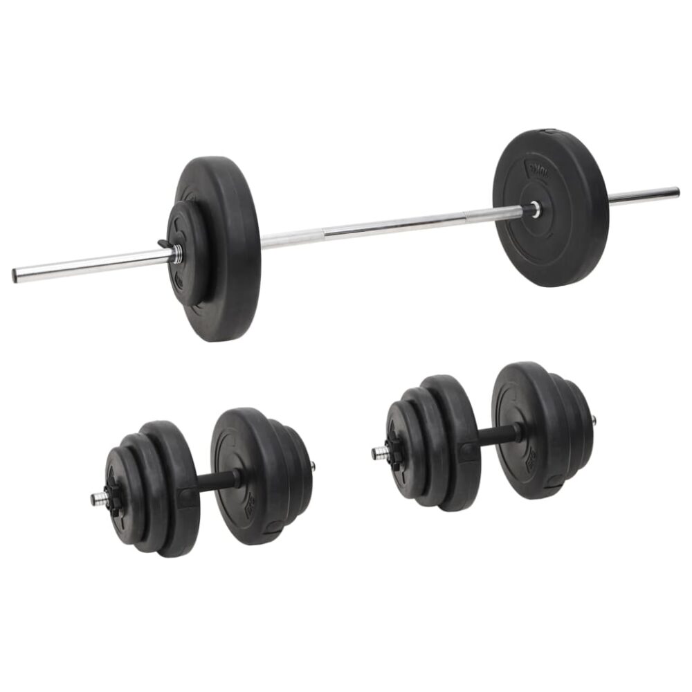 Esta versátil barra com discos será a escolha perfeita para quem procura várias opções de treino. Material durável: feita de aço cromado, a barra é certamente resistente e estável. Os discos para a barra são feitos de cimento e estão cobertos por um plástico robusto que protege o chão, permitindo que não ouça qualquer barulho irritante que poderia ser causado pelo seu uso.Conjunto de pesos diferentes: uma combinação adequada é facilmente feita com os 4 pesos diferentes, – 2 x 10 kg, 4 x 5 kg, 6 x 1,25 kg e 4 x 2,5 kg. Os diferentes conjuntos de discos podem sempre satisfazer as suas diferentes necessidades de treino.Peso claramente estampado: o peso está claramente estampado em cada disco, para uma identificação rápida e fácil.Discos multifuncionais: o conjunto de barra e discos multifuncionais são adequados para treinar os músculos do seu peito, bíceps, braços, tríceps e costas.Prático bloqueador em estrela: os bloqueadores em forma de estrela garantem que os pesos se mantêm no lugar com firmeza. Nota:Cada produto é fornecido com um manual de instruções na caixa para facilitar a montagem.