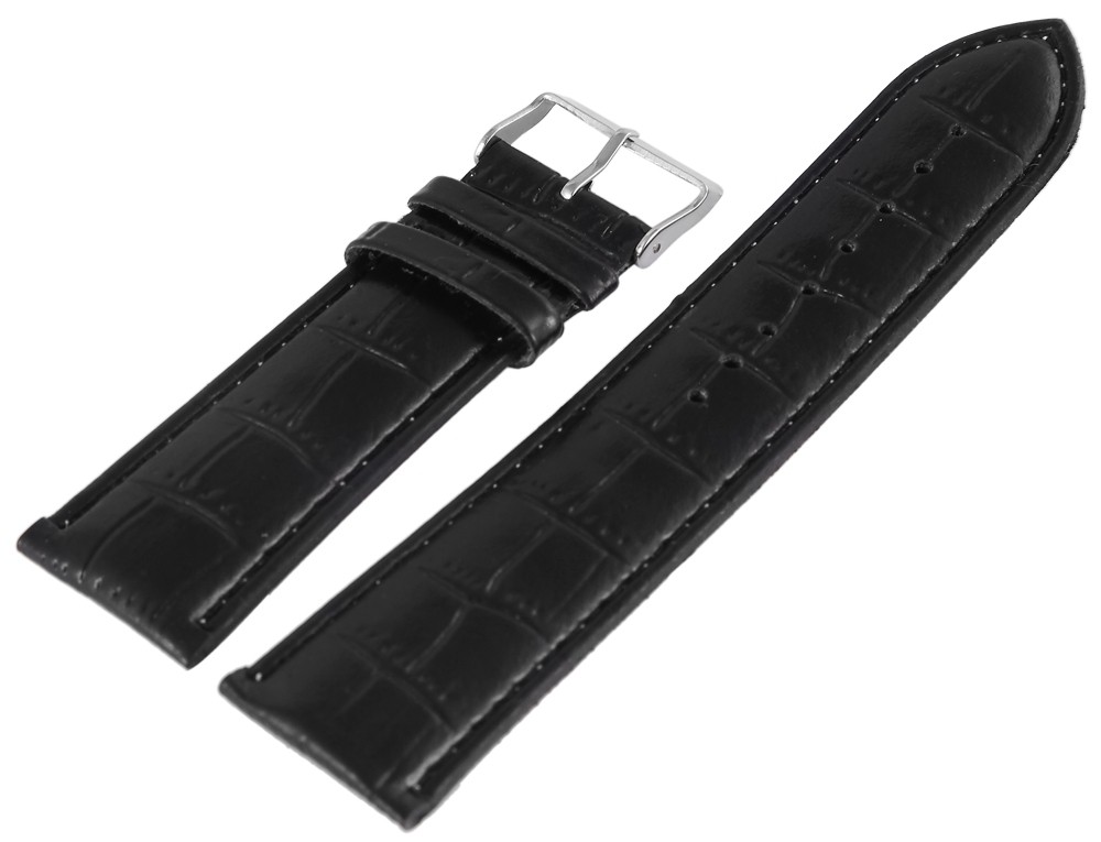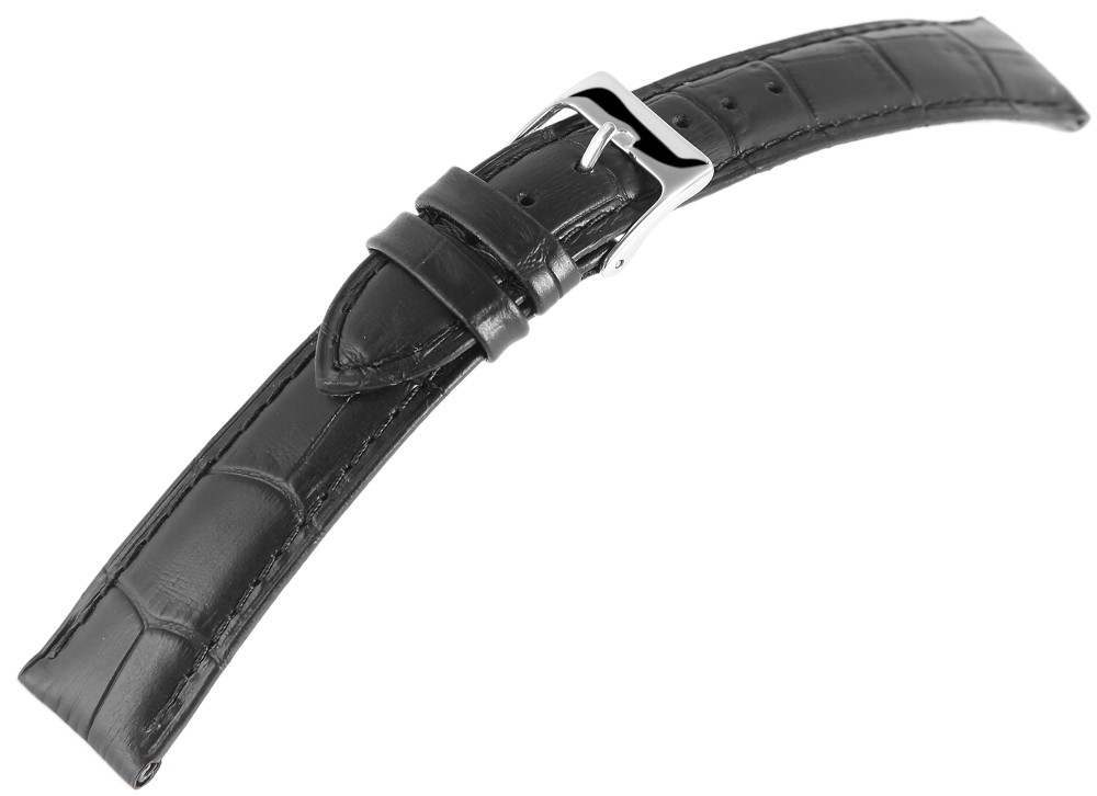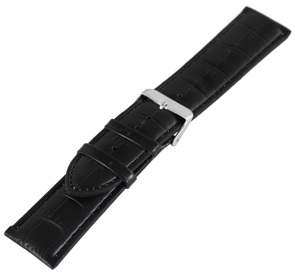 Pulseira de substituição em couro legítimo preto com costura preta e fecho prateado.