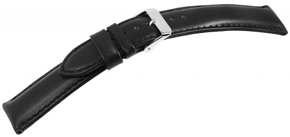Bracelete básica em pele genuína preta. A bracelete tem uma fivela de pino prateada e duas presilhas. A parte perfurada afunila-se na extremidade. O PVP é de 14,95 euros.