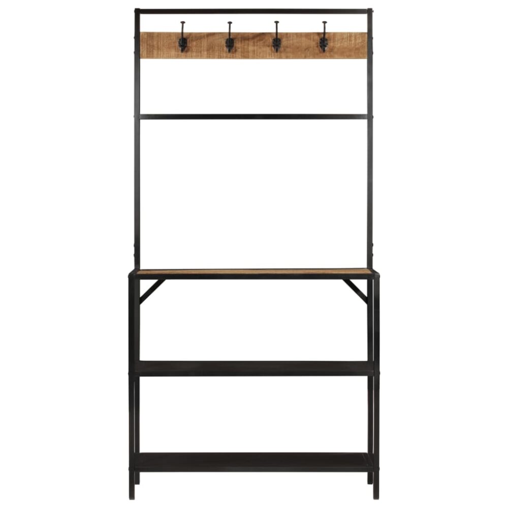 Este prático bengaleiro com arrumação para sapatos manterá os teus pertences organizados e facilmente acessíveis! Suporte para casacos 2 em 1: este bengaleiro inclui 4 ganchos que proporcionam muito espaço para pendurar casacos, malas, chapéus, cachecóis e outros objetos, além de três prateleiras para guardar sapatos, caixas de arrumação, malas de mão e outros artigos. Madeira de mangueira maciça: fabricado em madeira de mangueira maciça, este bengaleiro para casacos e sapatos é robusto e estável. A madeira de mangueira maciça é uma madeira de lei tropical utilizada para produzir móveis robustos. Os bonitos grãos da madeira tornam cada peça de mobiliário ligeiramente diferente das restantes. Estrutura em ferro: a estrutura de ferro confere-lhe uma robustez e estabilidade adicionais. Amplas aplicações:…