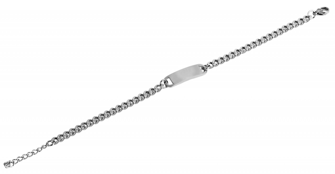 A pulseira gravável prateada é feita de aço inoxidável em padrão de tanque. Tem 17 cm de comprimento e uma placa de gravação de 21 mm de comprimento e 7 mm de largura no meio. Tem uma espessura de 2 mm e pode ser gravado com vários desenhos. A pulseira pode ser aberta e fechada com um mosquetão resistente, também feito de aço inoxidável. Uma corrente de extensão de 3 cm de comprimento é presa à corrente do meio-fio, o que permite que o comprimento seja variado em 3 cm. As dimensões da pulseira são uma largura de 4 mm e uma espessura de material de 1,5 mm.