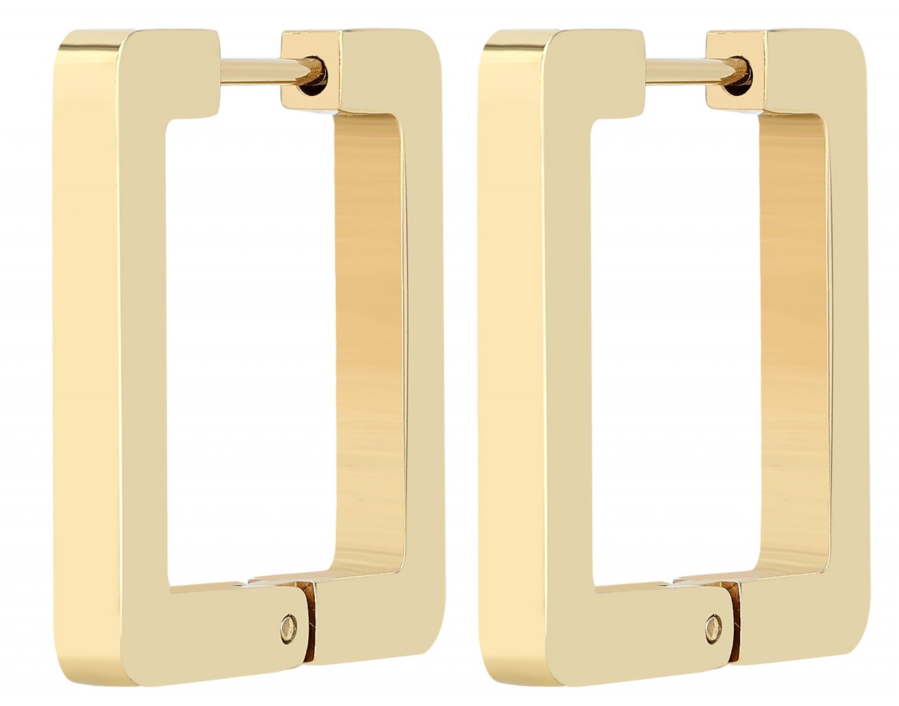 Os brincos de argola quadrados são feitos de aço inoxidável e têm um visual simples e brilhante.  O fecho é feito de aço inoxidável e é prático, permitindo fácil colocação e retirada, além de garantir uma fixação segura no orifício da orelha. Têm altura de 23 mm, largura de 3 mm e espessura de 3 mm.