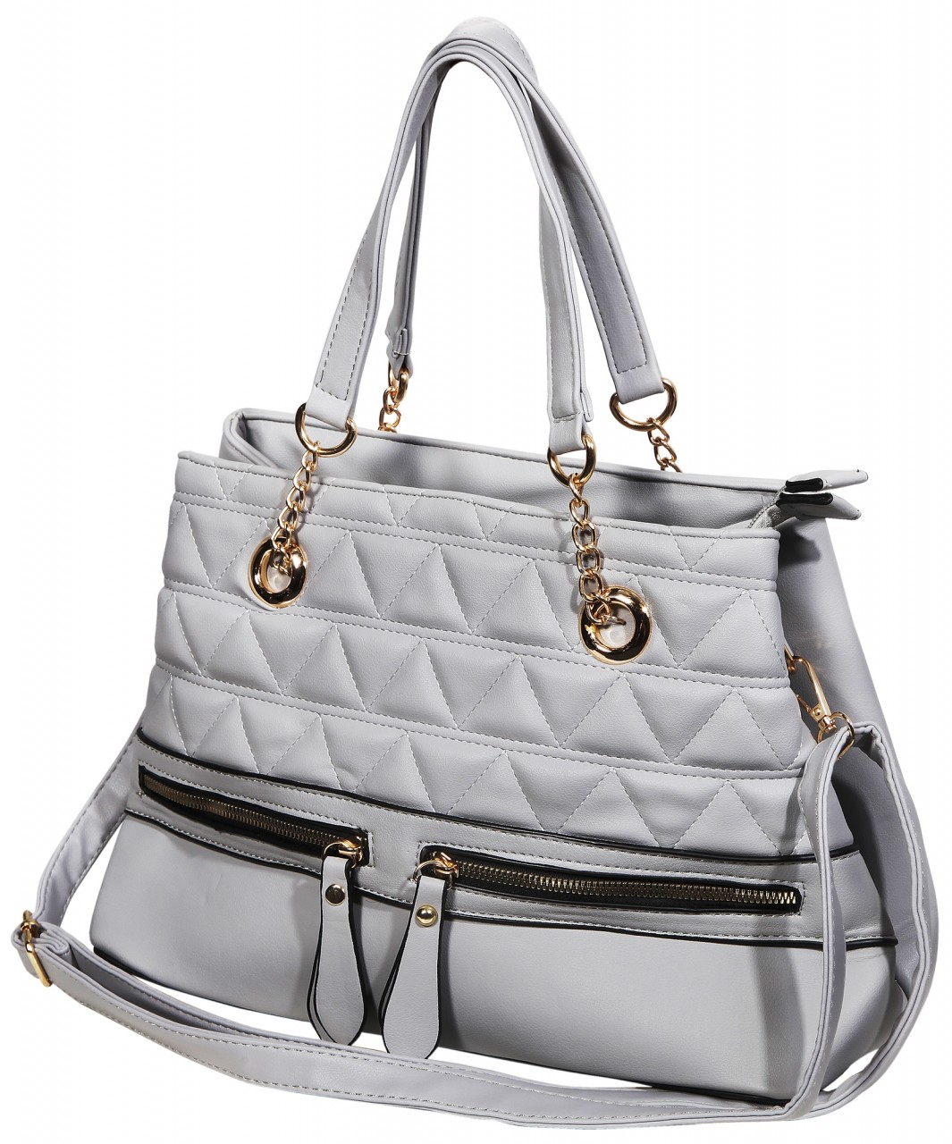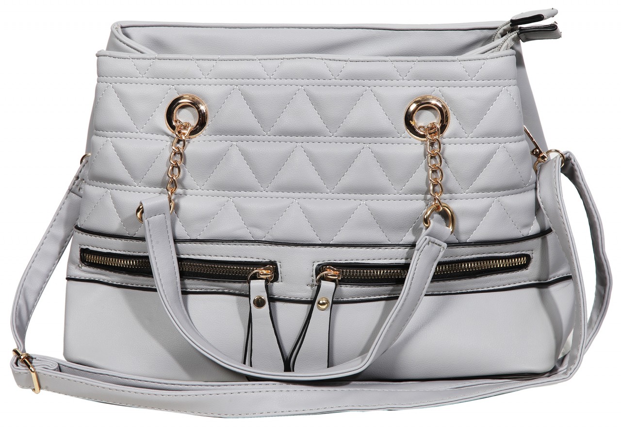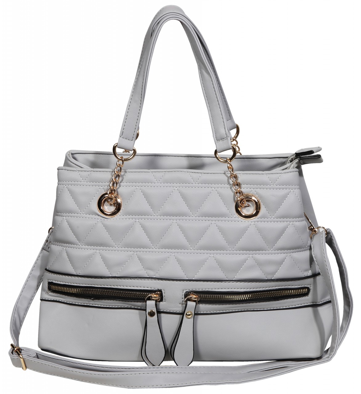 Bolsa feminina feita em pele sintética. Metade da frente é costurada em padrão triangular, o resto da bolsa tem superfície lisa. A bolsa possui duas alças de transporte curtas, bem como uma alça de transporte longa e removível. As alças de transporte são fixadas na bolsa em ambos os lados com pequenos pedaços de corrente. Na parte frontal da bolsa há dois fechos um ao lado do outro na parte inferior, que indicam dois pequenos bolsos externos. Há também um fecho na parte de trás da bolsa, atrás do qual há um compartimento externo. A bolsa é dividida em dois grandes compartimentos principais, que também podem ser abertos através de dois fechos. Há também um compartimento interno estreito…