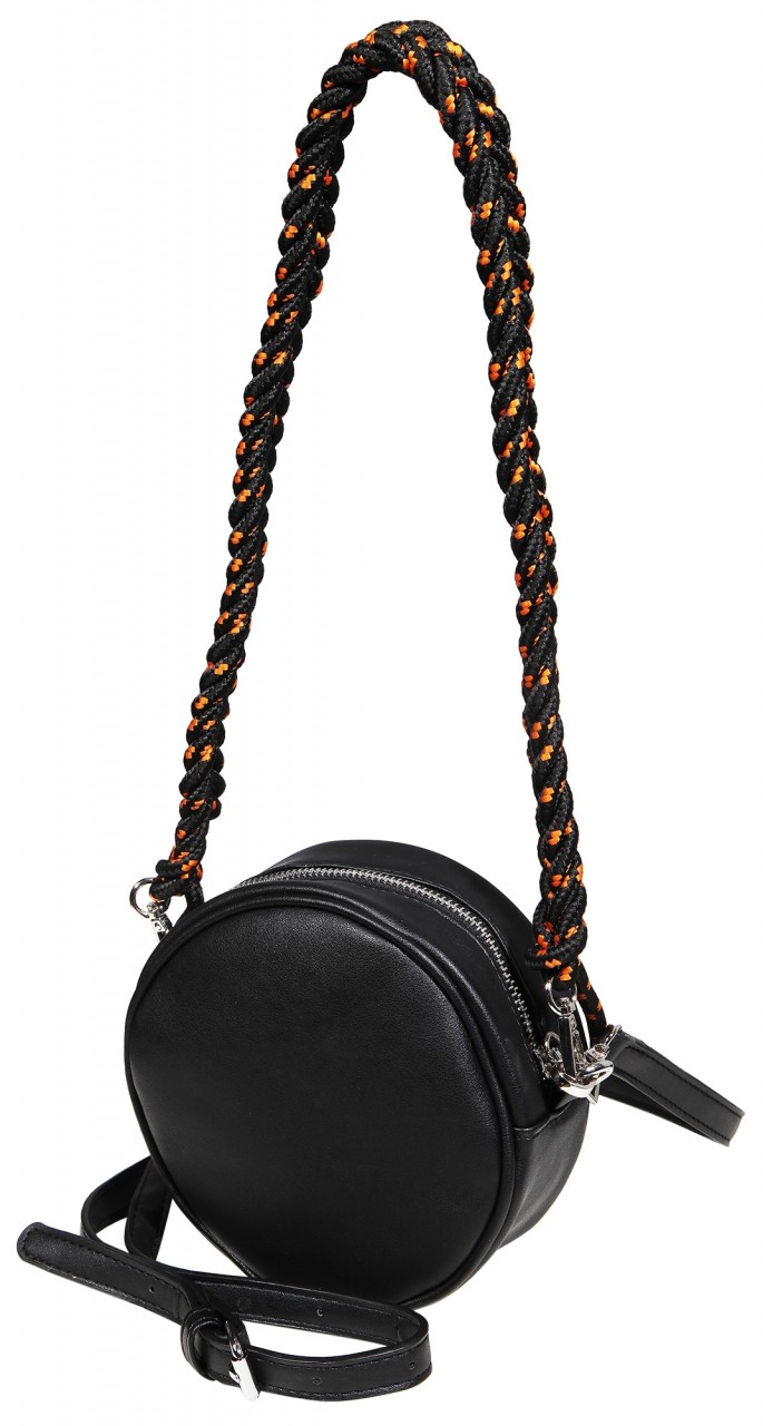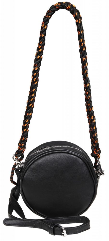 Bolsa feita em pele sintética. Dimensões: 15 cm de comprimento, 5 cm de largura e 15 cm de altura.