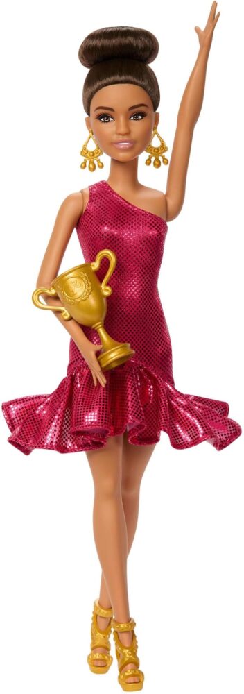 Esta boneca da linha Barbie “Tu Podes Ser”, convida as crianças a explorar o mundo da dança de salão com postura, graça e muita diversão. Com um vestido vermelho cintilante com folhos elegantes, sapatos dourados de salto e tiras finas, e ainda um troféu de dança como acessório, a Barbie Bailarina de Salão está pronta para dar espetáculo.