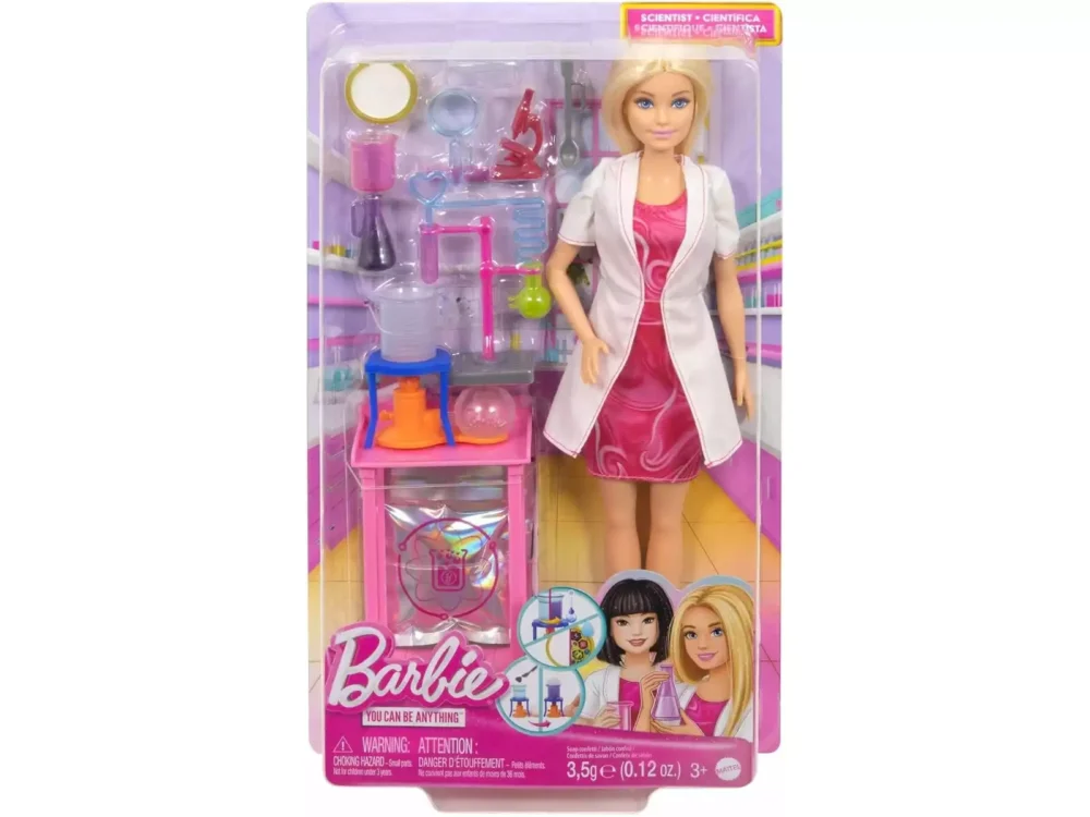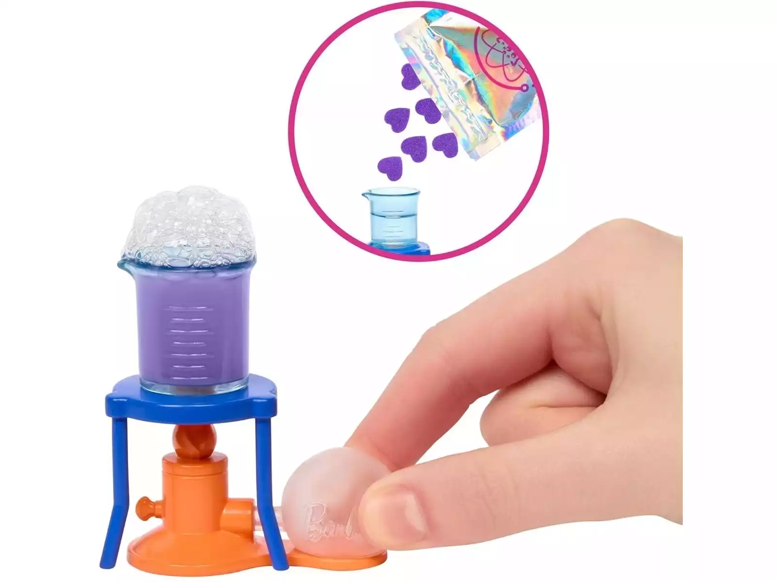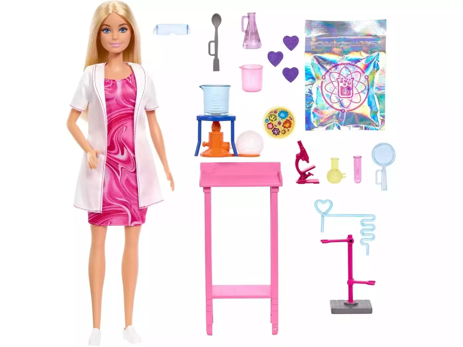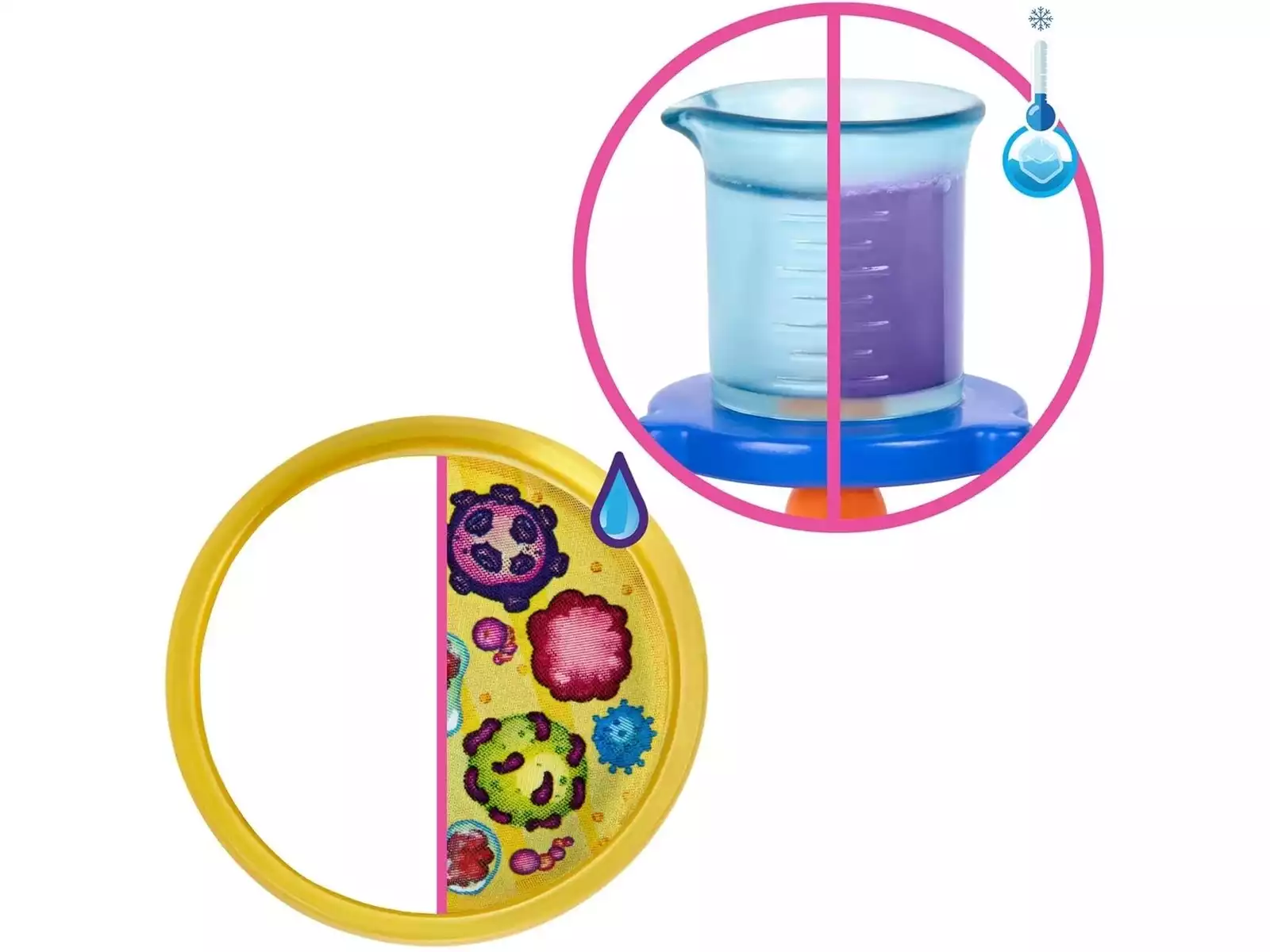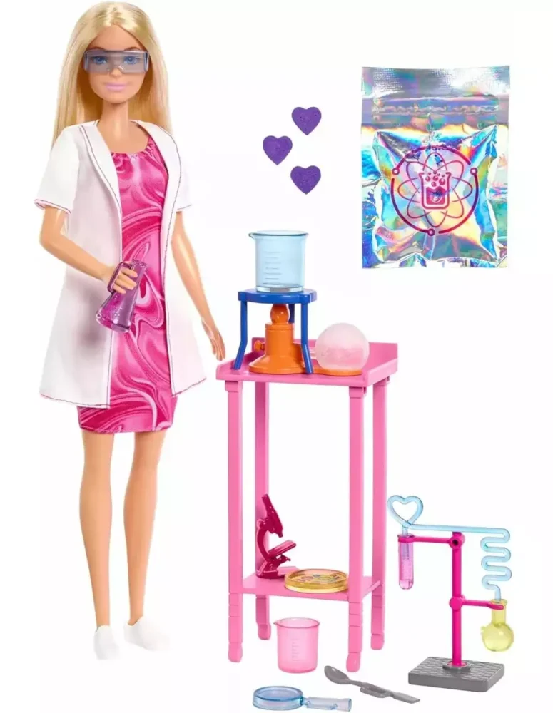 - Inclui: 1 boneca com bata e óculos de proteção, 1 mesa de laboratório e vários acessórios de experiências (como um copo de laboratório que muda de cor)