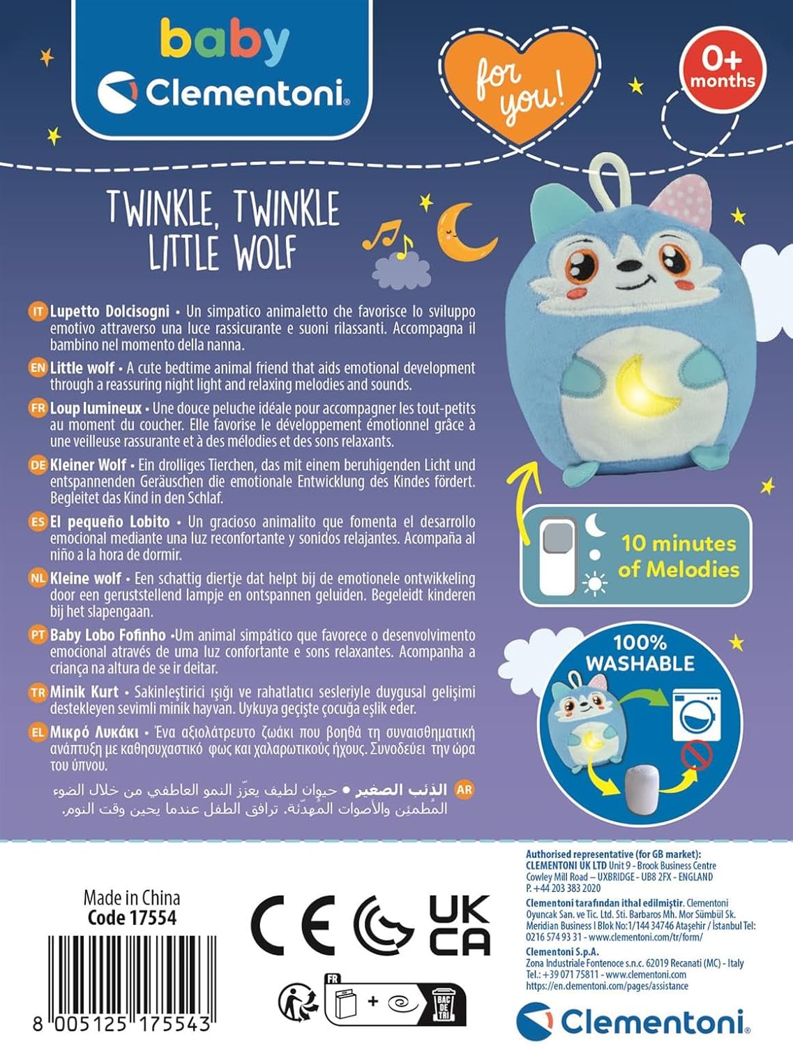 • TWINKLE TWINKLE LITTLE WOLF: um lupetto que faz de candeeiro noturno para bebés e cria um ambiente relaxante à volta do bebé, com luzes suaves e melodias calmantes para favorecer o sono tranquilo; ideal para momentos antes de dormir e durante a noite