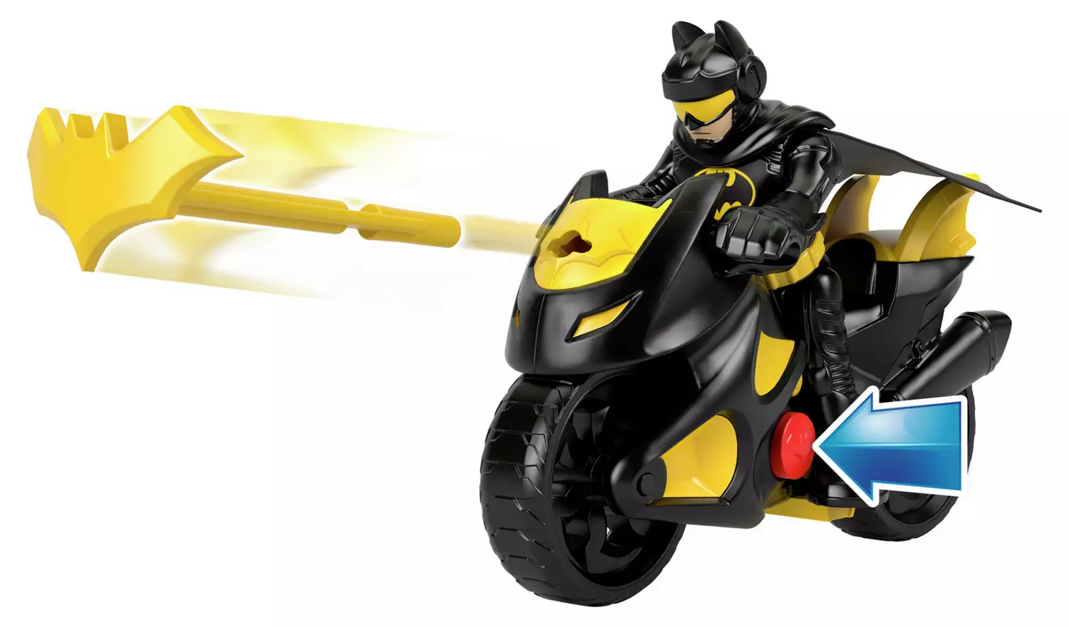 - “Batman” vem com sua Batcycle interativa, “Mulher Maravilha” com um todo-o-terreno e “Cyborg” com um carro de corrida.