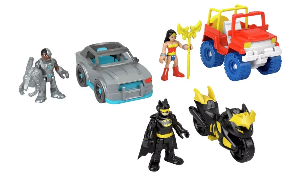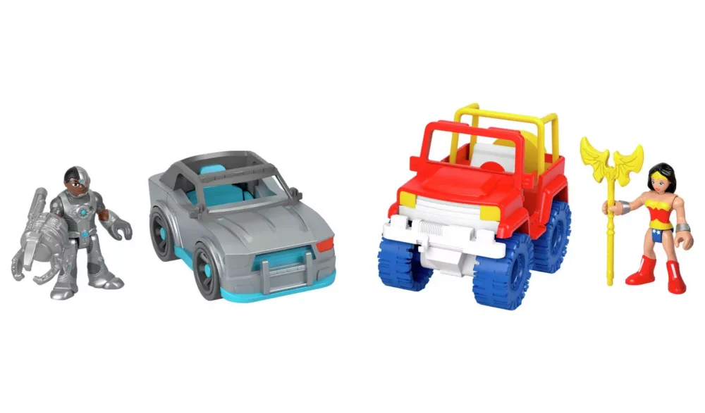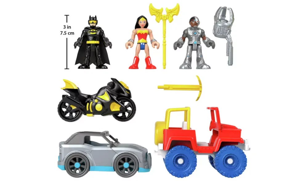 - “Batman” vem com sua Batcycle interativa, “Mulher Maravilha” com um todo-o-terreno e “Cyborg” com um carro de corrida.