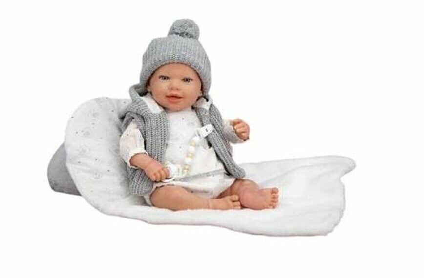- Este bebé reborn tem as extremidades de vinil e o corpo macio, oferecendo assim um toque muito suave e um enchimento de bolinhas que proporcionam estabilidade e peso. Os seus braços e pernas são compostos de vinil, um material de alta qualidade e muito macio, que permite fornecer detalhes muito realistas, como vermelhidão da pele, venitas ou decoração de unhas.
