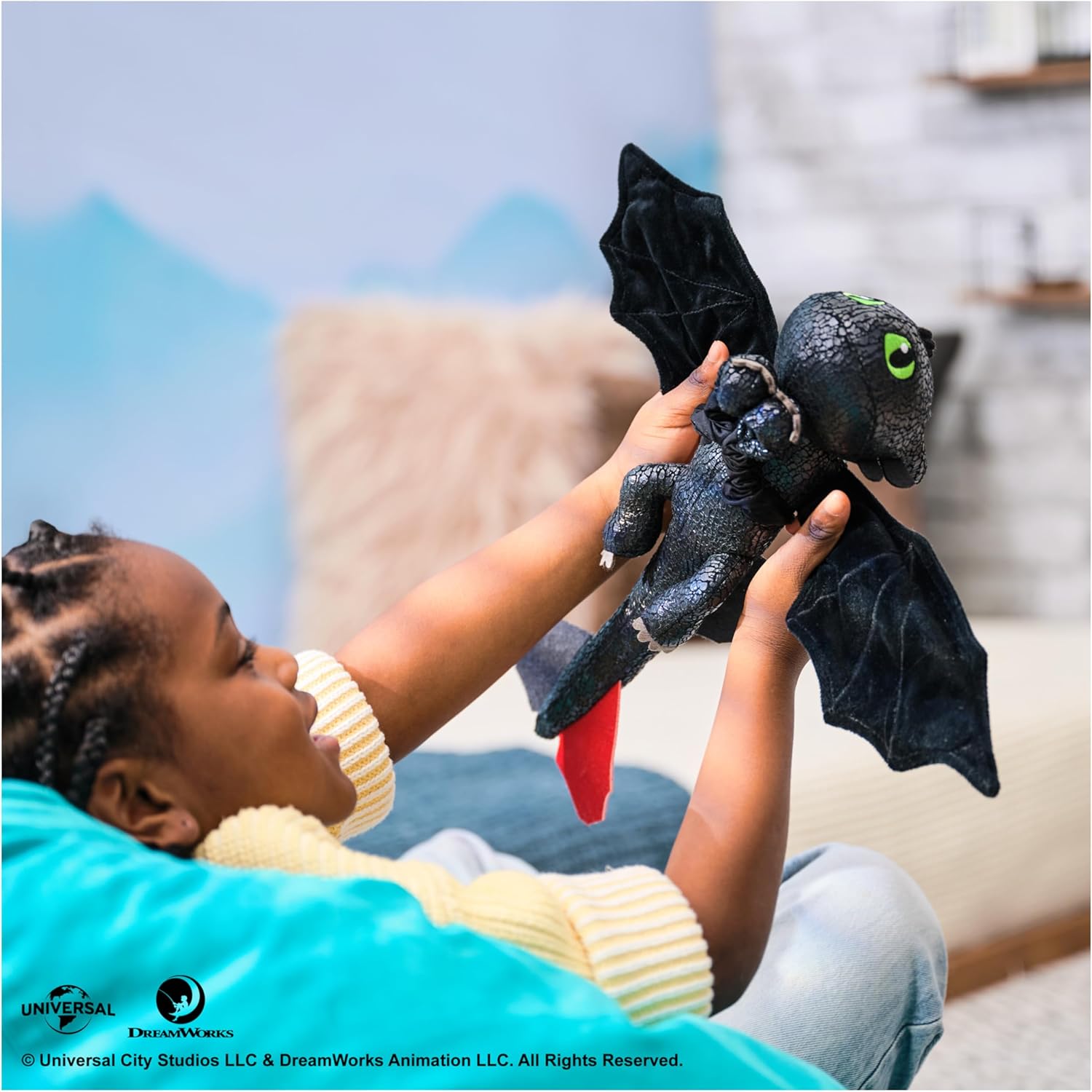 - Asas que abraçam você: Desdentado também gosta de aconchegar-se. Depois de deslizar épicamente, as amplas asas de peluche deste brinquedo de dragão dobram-se para dentro para segurar o seu braço e desfrutar de um momento divertido