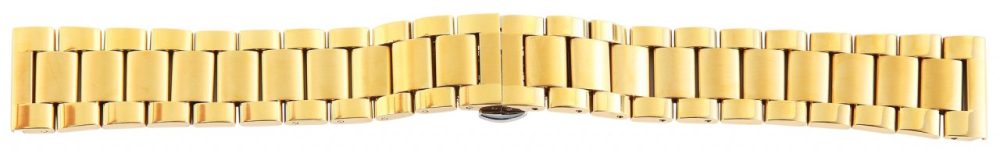 A bracelete do relógio dourada é feita de aço inoxidável e pode ser aberta e fechada usando um fecho borboleta dourado. Está disponível em larguras de terminais de 18 mm, 20 mm, 22 mm e 24 mm. A bracelete de reposição é composta por vários elementos que podem ser removidos com pouco esforço. Isto significa que a bracelete pode ser ajustada individualmente a cada pulso. Cada elemento individual consiste em três partes individuais, que fazem com que a pulseira de aço inoxidável pareça três fileiras quando montada. As duas bordas externas são polidas e a linha do meio é fosca. Este tipo de tratamento de superfície faz com que a…