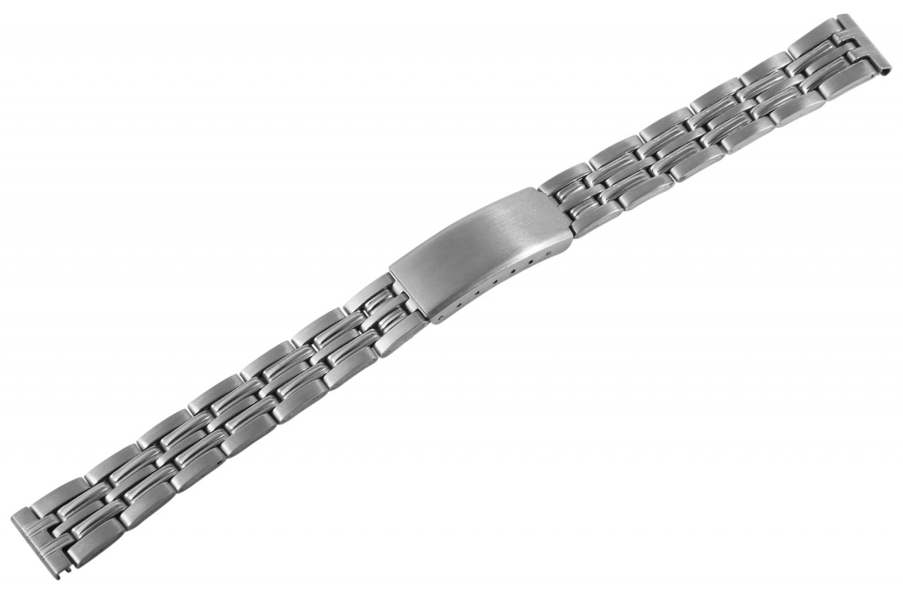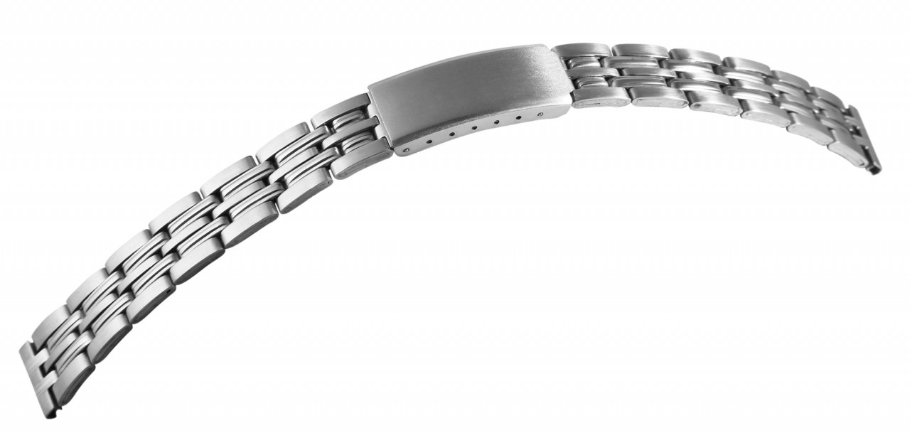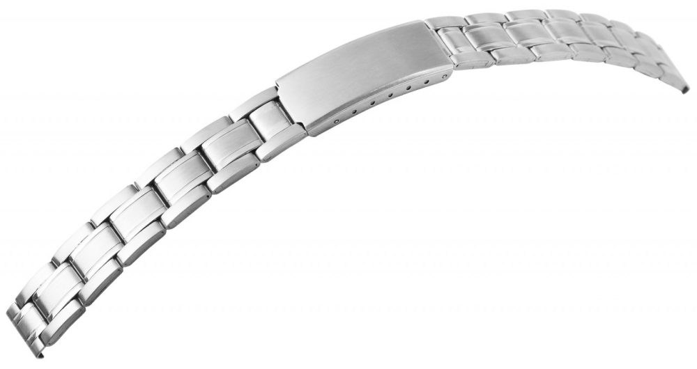 Bracelete elos prateada para relógio em aço inoxidável tem 12 mm com fecho dobrável em aço inoxidável.