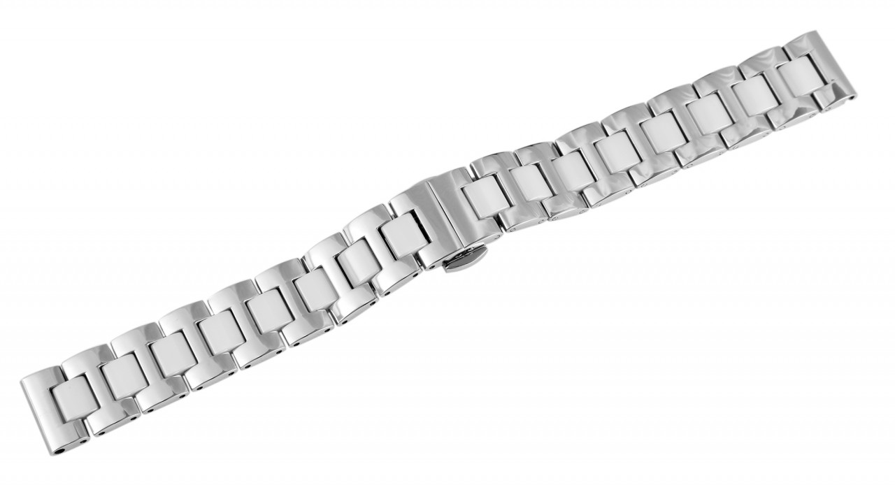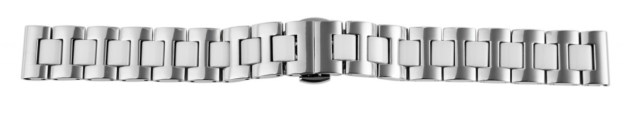 A bracelete de substituição do relógio é feita de aço inoxidável prateado e cerâmica branca e pode ser aberta e fechada usando um fecho dobrável tipo borboleta em aço inoxidável prateado. A bracelete de reposição é composta por vários elementos que podem ser removidos com pouco esforço. Isto significa que a pulseira pode ser ajustada individualmente a cada pulso. O comprimento total da banda é de 18,5 cm. A bracelete de aço inoxidável está disponível em larguras de 14 mm, 16 mm e 18 mm. A alça é reta e, portanto, compatível com todos os relógios. As duas bordas externas e a barra central dos elementos são polidas e os elementos internos são feitos de cerâmica…
