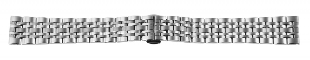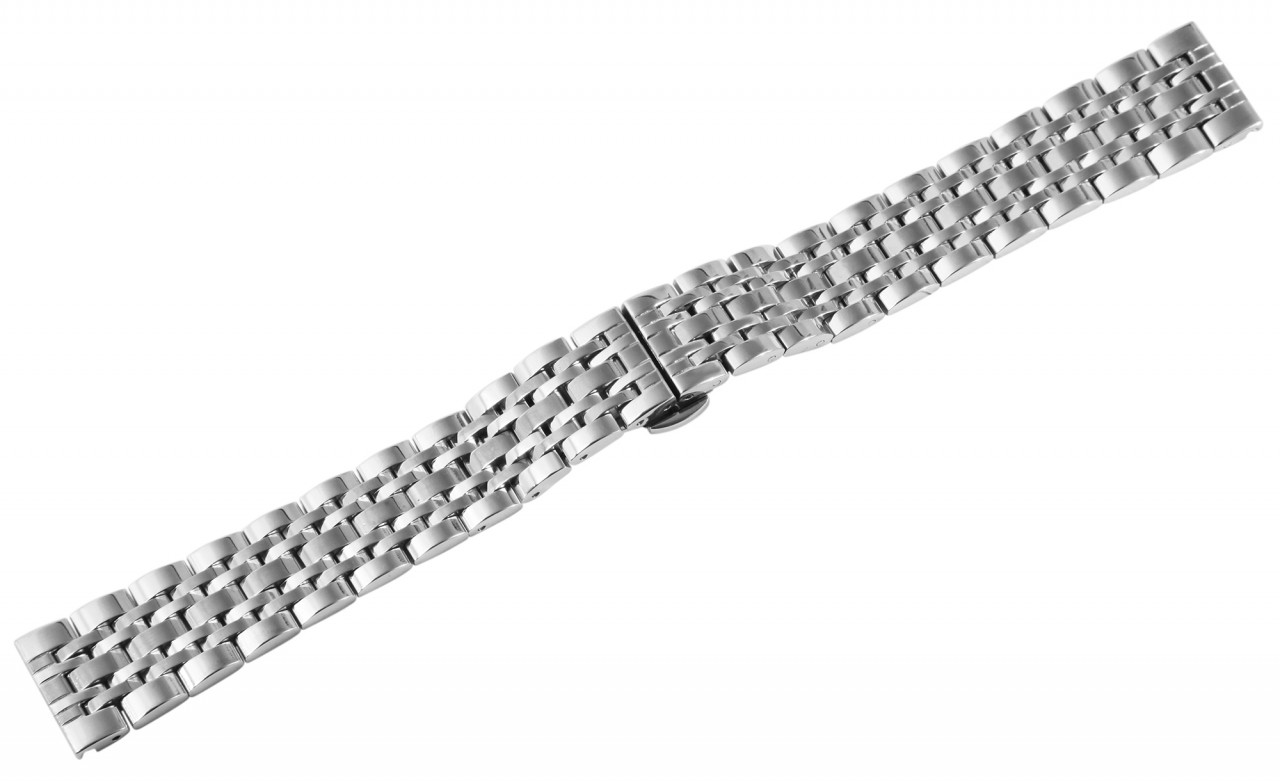 A bracelete do relógio prateada é feita de aço inoxidável e pode ser aberta e fechada usando um fecho dobrável tipo borboleta em aço inoxidável prateado. Está disponível em larguras de terminais de 16 mm, 18 mm, 20 mm e 22 mm. A bracelete de reposição é composta por vários elementos que podem ser removidos com pouco esforço. Isto significa que a bracelete pode ser ajustada individualmente a cada pulso. Cada elemento individual da pulseira consiste em sete partes individuais, o que faz com que a pulseira de aço inoxidável pareça ter sete fileiras quando montada. A superfície da bracelete é alternadamente polida e fosca de fora para dentro. Este tipo de tratamento de superfície confere à bracelete um aspecto desportivo e elegante e por isso adapta-se perfeitamente a qualquer relógio. As dimensões da bracelete de elos resultam de um comprimento total de 17 cm e uma espessura de material de 4 mm.
