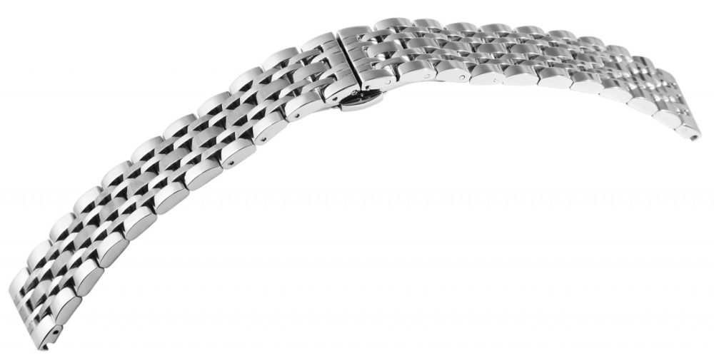 A bracelete do relógio prateada é feita de aço inoxidável e pode ser aberta e fechada usando um fecho dobrável tipo borboleta em aço inoxidável prateado. Está disponível em larguras de terminais de 16 mm, 18 mm, 20 mm e 22 mm. A bracelete de reposição é composta por vários elementos que podem ser removidos com pouco esforço. Isto significa que a bracelete pode ser ajustada individualmente a cada pulso. Cada elemento individual da pulseira consiste em sete partes individuais, o que faz com que a pulseira de aço inoxidável pareça ter sete fileiras quando montada. A superfície da bracelete é alternadamente polida e fosca de fora para dentro. Este tipo de tratamento de superfície confere à bracelete um aspecto desportivo e elegante e por isso adapta-se perfeitamente a qualquer relógio. As dimensões da bracelete de elos resultam de um comprimento total de 17 cm e uma espessura de material de 4 mm.