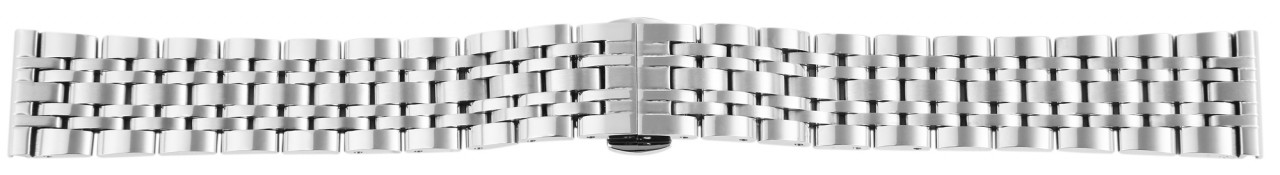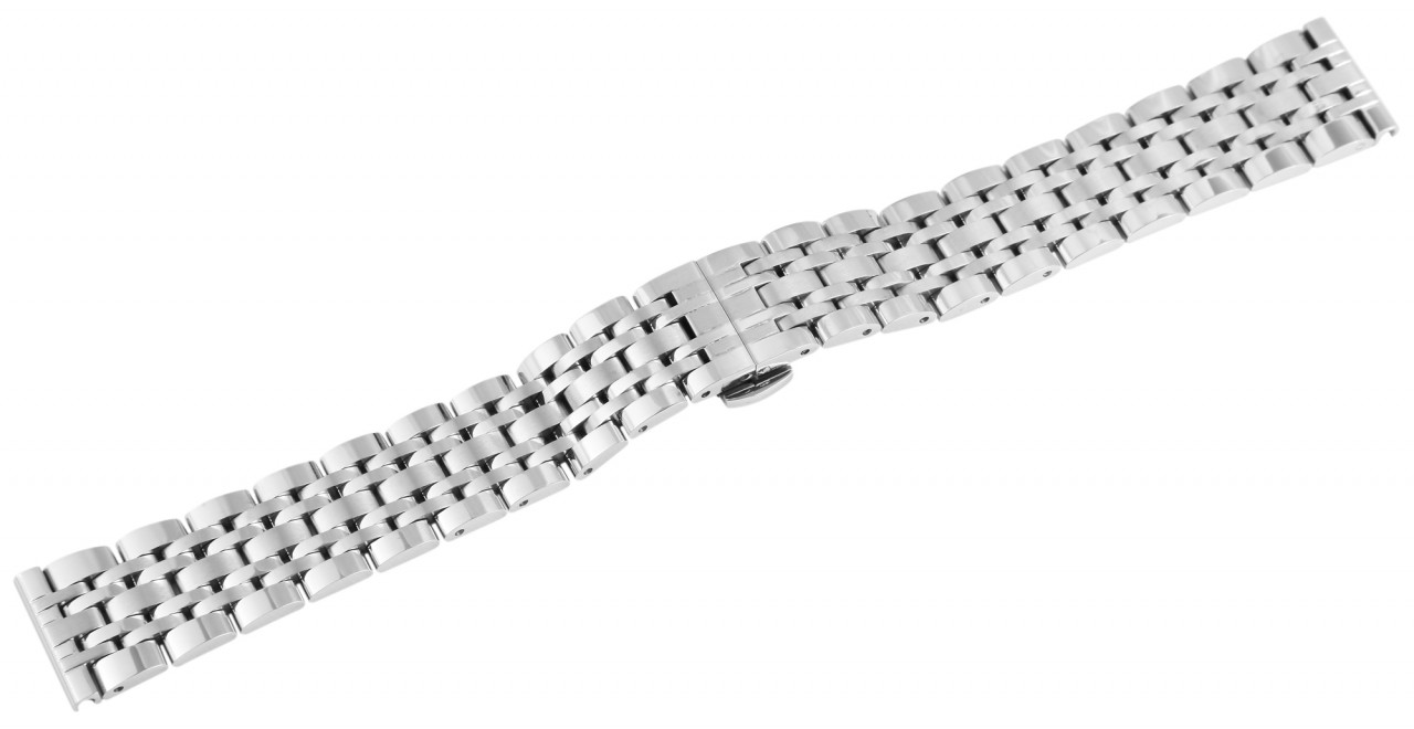 A bracelete de reposição do relógio prateada é feita de aço inoxidável e pode ser aberta e fechada usando um fecho dobrável tipo borboleta em aço inoxidável prateado. A bracelete de reposição é composta por vários elementos que podem ser removidos com pouco esforço. Isto significa que a pulseira pode ser ajustada individualmente a cada pulso. Cada elemento consiste em sete partes individuais. Isso faz com que a banda pareça ter sete fileiras. As bordas externas e todos os outros elementos são polidos e os elementos intermediários e o elemento intermediário são foscos. Este tipo de tratamento de superfície faz com que a bracelete do relógio pareça desportiva e elegante e, portanto, adapta-se perfeitamente a qualquer relógio. O comprimento total da banda é de 17 cm. A bracelete de aço inoxidável está disponível em larguras de 18 mm, 20 mm, 22 mm, 24 mm e 26 mm. A alça é reta e, portanto, compatível com todos os relógios.