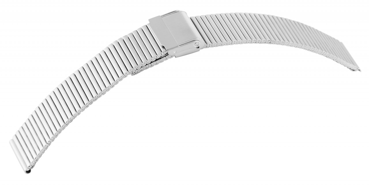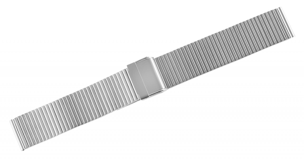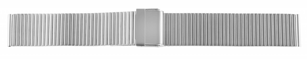 A bracelete de malha prateada para relógios em aço inoxidável, tem 22 mm com fecho de gancho em aço inoxidável.