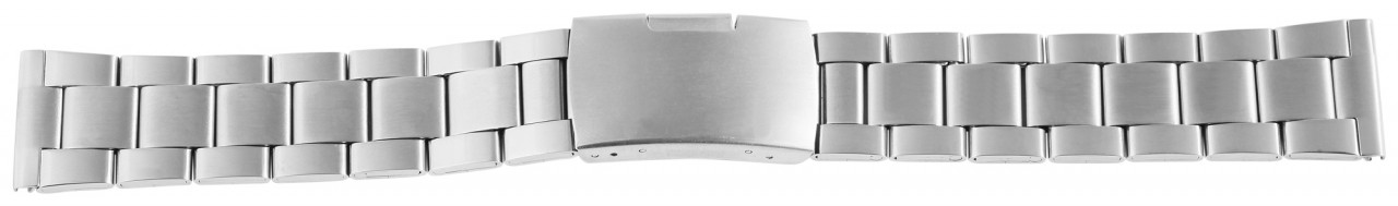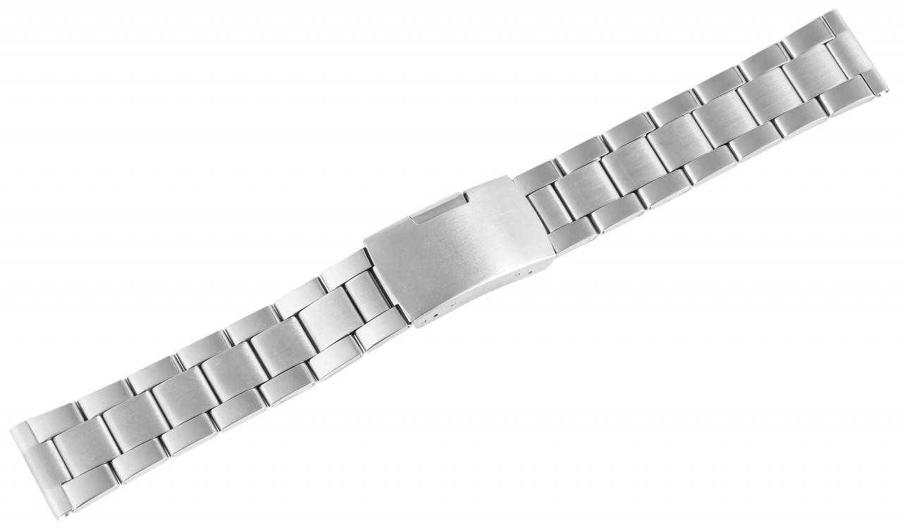 A Bracelete do relógio prateada é feita de aço inoxidável e pode ser aberta e fechada usando um fecho dobrável em aço inoxidável prateado. Está disponível em larguras de terminais de 18 mm, 20 mm, 22 mm e 24 mm. A pulseira de reposição é composta por vários elementos que podem ser removidos com pouco esforço. Isto significa que a bracelete pode ser ajustada individualmente a cada pulso. Cada elemento individual consiste em três partes individuais, que fazem com que a pulseira de aço inoxidável pareça três fileiras quando montada. As duas bordas externas são polidas e a linha do meio é fosca. Este tipo de tratamento de superfície faz com que a bracelete do relógio pareça simples, mas também elegante e, portanto, adapta-se perfeitamente a qualquer relógio. O comprimento total da pulseira de elos é de 17,5 cm.