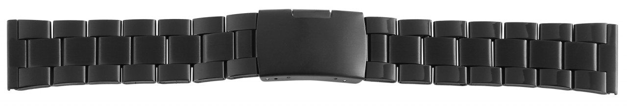 A bracelete preta do relógio é feita de aço inoxidável e pode ser aberta e fechada usando um fecho dobrável em aço inoxidável preto. Está disponível em larguras de terminais de 18 mm, 20 mm, 22 mm e 24 mm. A bracelete de reposição é composta por vários elementos que podem ser removidos com pouco esforço. Isto significa que a pulseira pode ser ajustada individualmente a cada pulso. Cada elemento individual consiste em três partes individuais, que fazem com que a bracelete de aço inoxidável pareça três fileiras quando montada. As duas bordas externas são polidas e a linha do meio é fosca. Este tipo de tratamento de superfície faz com que a bracelete do relógio pareça simples, mas também elegante e, portanto, adapta-se perfeitamente a qualquer relógio. O comprimento total da bracelete de elos é de 17,5 cm.