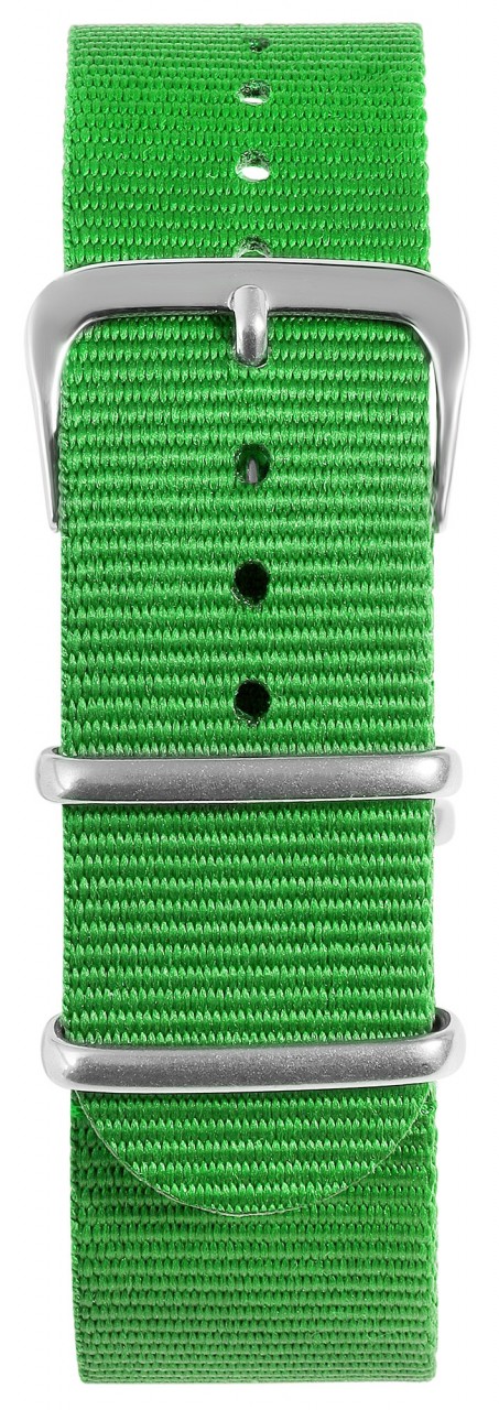 A bracelete de nylon verde está disponível em larguras de 14 mm, 16 mm, 18 mm, 20 mm e 22 mm. Ele pode ser facilmente fixado à caixa do relógio usando duas barras de mola padrão. A pulseira do relógio tem comprimento total de 24,5 cm, 25,5 cm, 26,5 cm e 28 cm. O comprimento total depende da largura do terminal. A bracelete pode ser aberta e fechada com uma fivela prateada. Além disso, dois laços de metal estão firmemente costurados na pulseira. O material macio torna a bracelete do relógio particularmente confortável de usar. A aparência simples permite que a pulseira de reposição seja fixada em qualquer tipo de relógio. Adapta-se visualmente bem à aparência geral dos relógios.