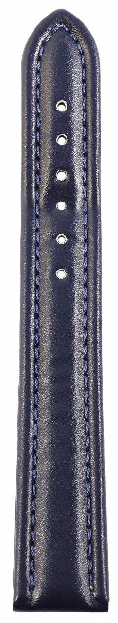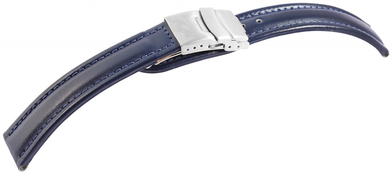 Bracelete clássica de reposição em pele genuína na cor azul escuro. A costura externa é em azul combinando. A parte superior da bracelete é acolchoada. A bracelete possui fecho dobrável em aço inoxidável. A parte do furo afunila até uma ponta no final.