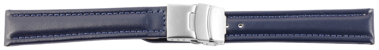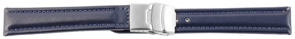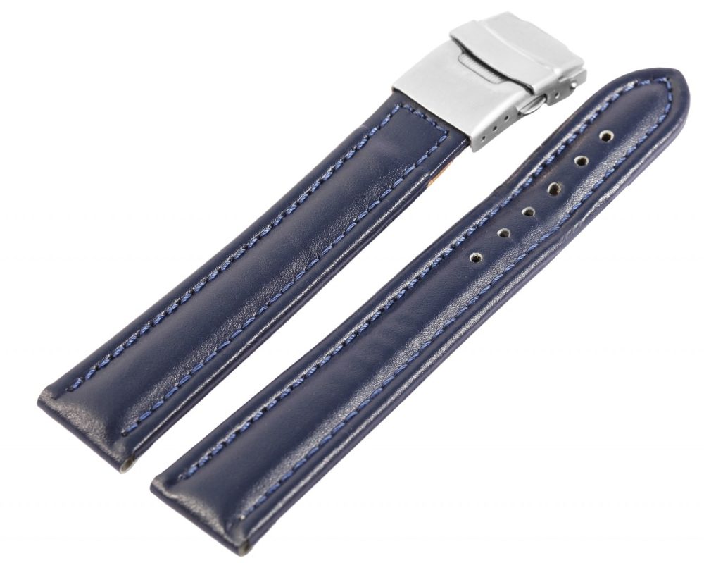 Bracelete clássica de reposição em pele genuína na cor azul escuro. A costura externa é em azul a combinar. A parte superior da bracelete é acolchoada. A bracelete possui fecho dobrável em aço inoxidável. A parte do furo afunila até uma ponta no final.