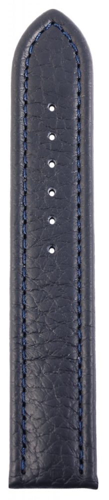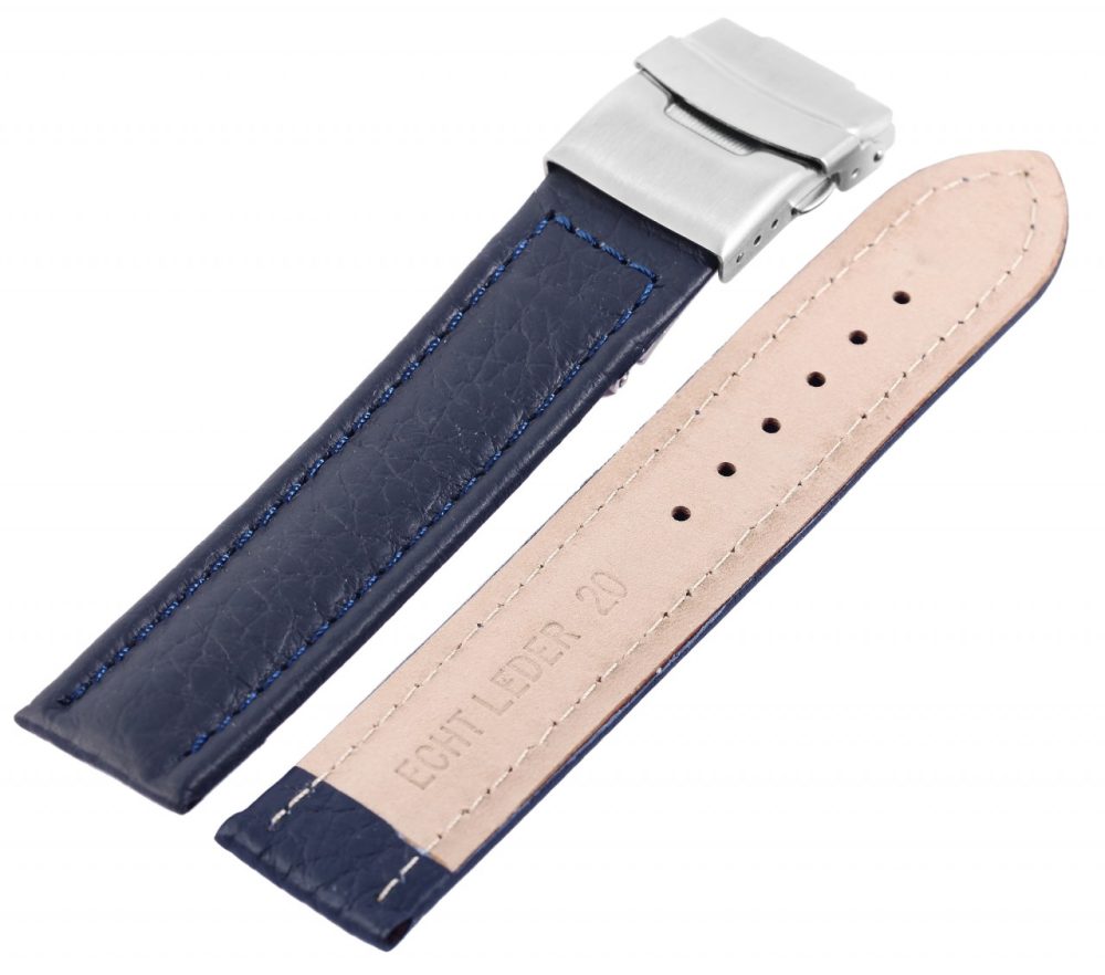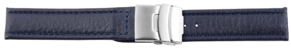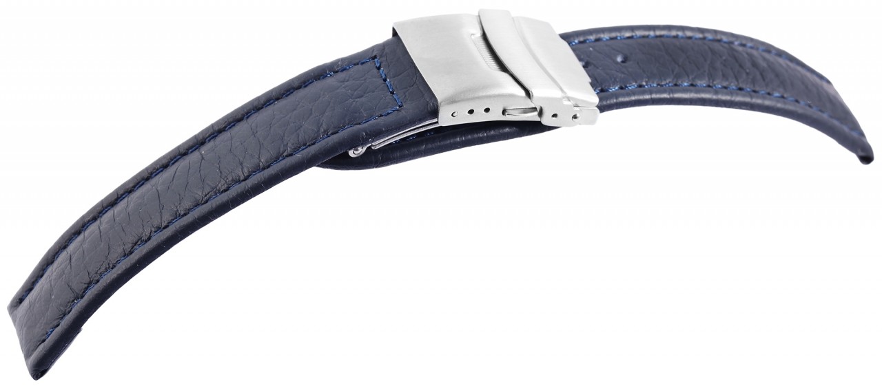 Bracelete clássica de reposição em pele genuína na cor azul escuro. A costura externa é em azul a combinar. A parte superior da bracelete é acolchoada. A bracelete possui fecho dobrável em aço inoxidável. A parte do furo afunila até uma ponta no final.