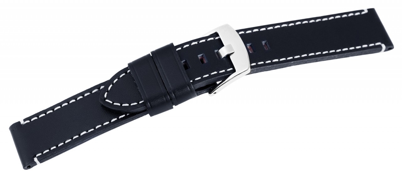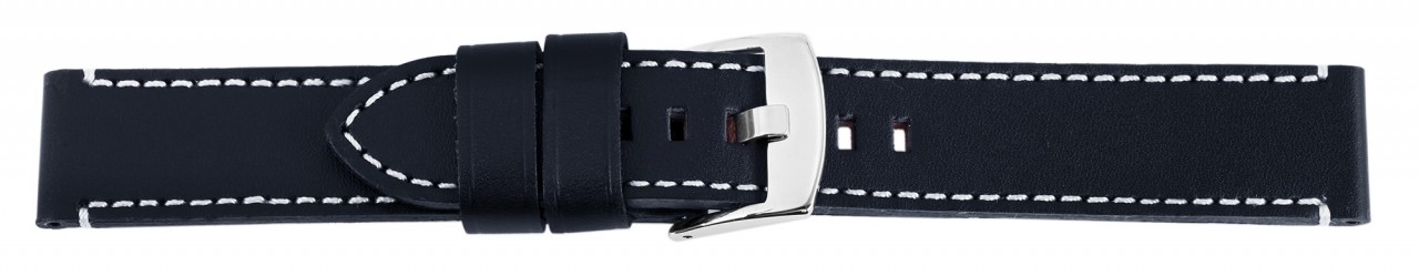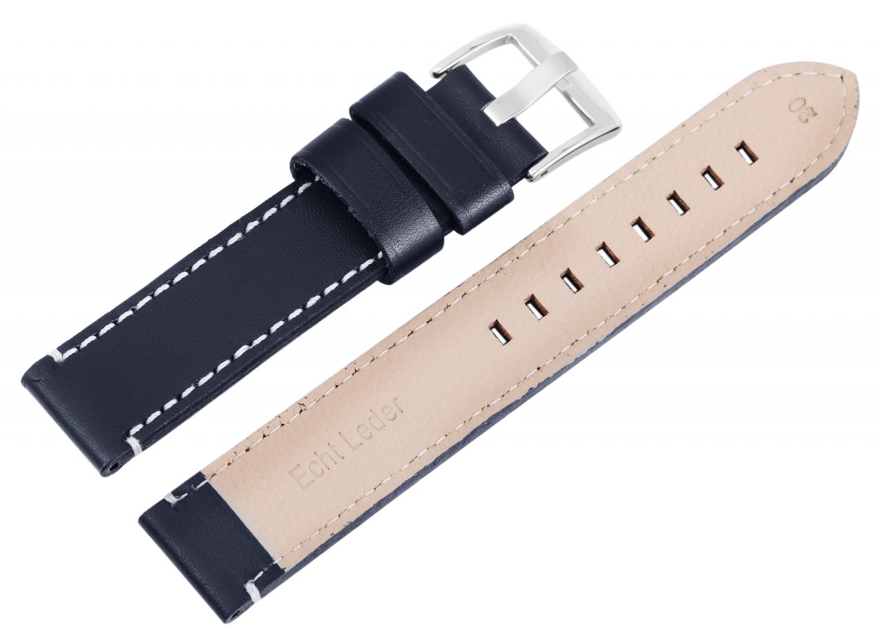 Bracelete básica de pele genuína em azul escuro com costura branca. A bracelete tem uma fivela prateada e duas presilhas. A parte do furo afunila até uma ponta no final. A bracelete é do tamanho XL e, portanto, é adequada para pulsos maiores.