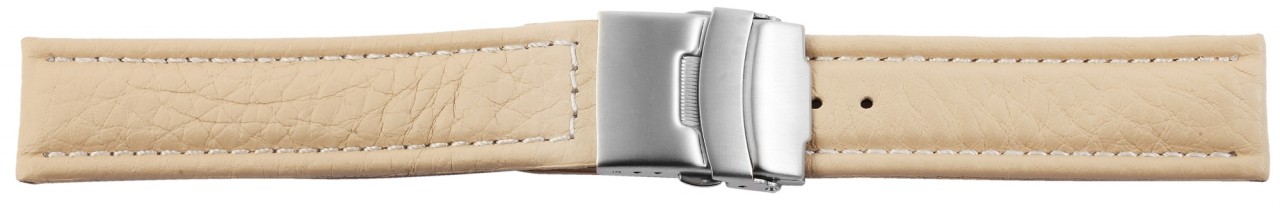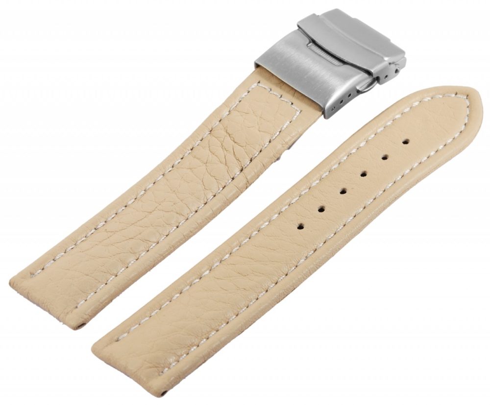 Bracelete clássica de reposição em pele genuína na cor bege. A costura externa é na cor branca. A parte superior da bracelete é parcialmente acolchoada. A bracelete possui fecho dobrável em aço inoxidável. A parte do furo afunila até uma ponta no final.