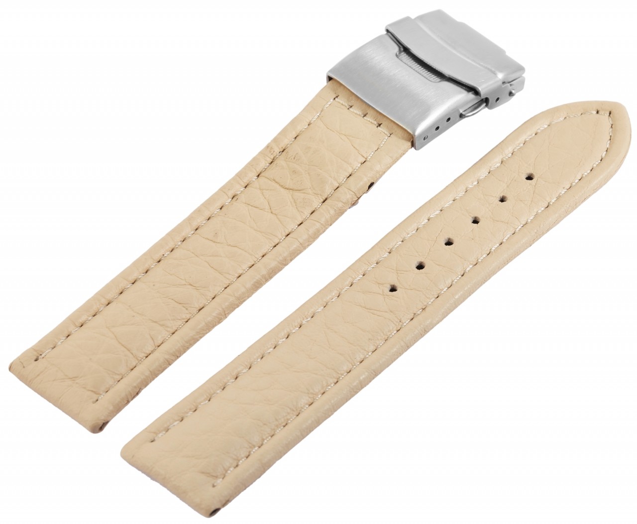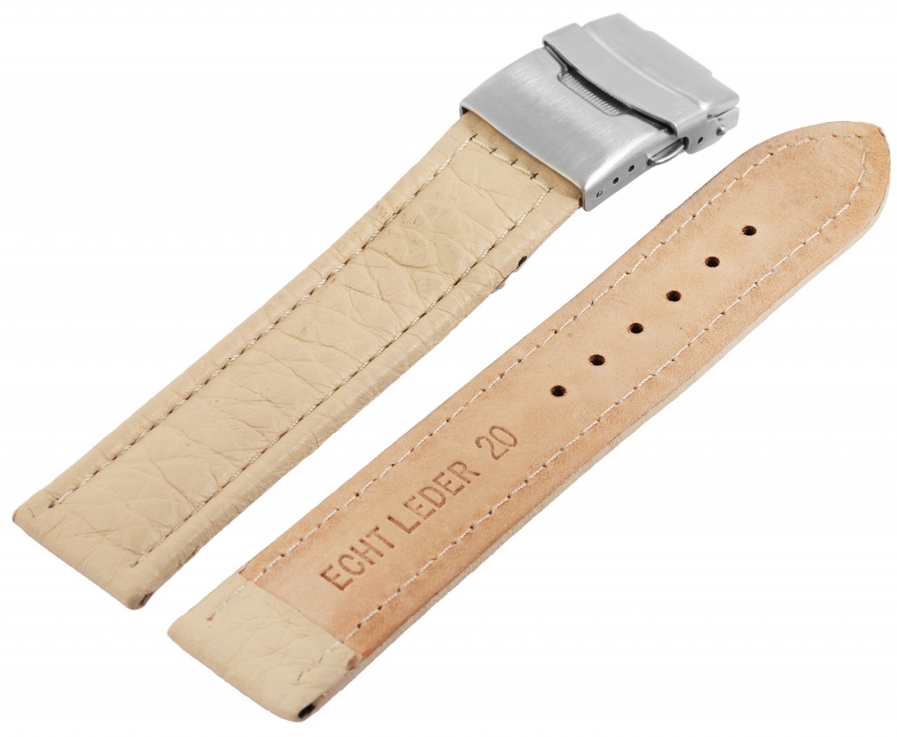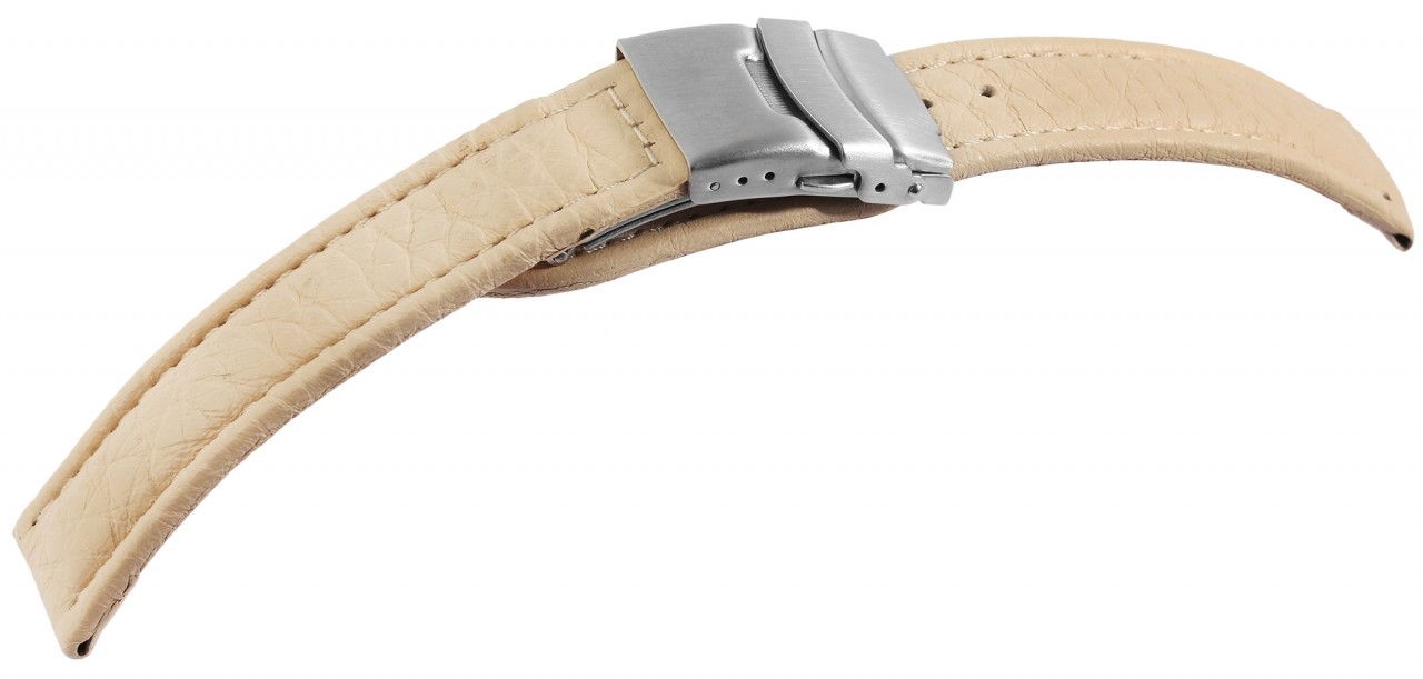 Bracelete bege de reposição em pele genuína. A costura externa é na mesma cor bege. A parte superior da bracelete é parcialmente acolchoada. A pulseira possui fecho dobrável em aço inoxidável. A parte do furo afunila até uma ponta no final.
