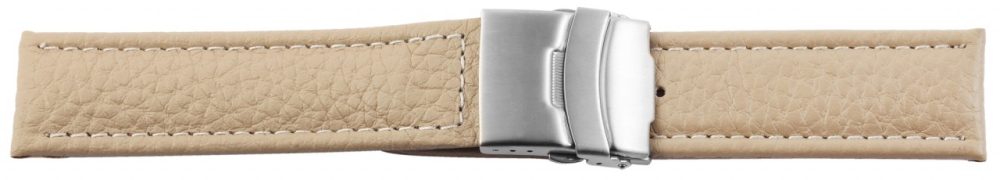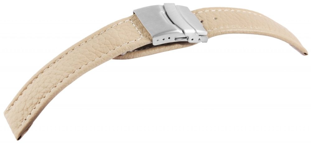 Bracelete bege de reposição em couro genuíno. A costura externa tem acabamento na cor correspondente. A parte superior da bracelete é acolchoada.  A bracelete possui fecho dobrável em aço inoxidável. A parte do furo afunila até uma ponta no final.
