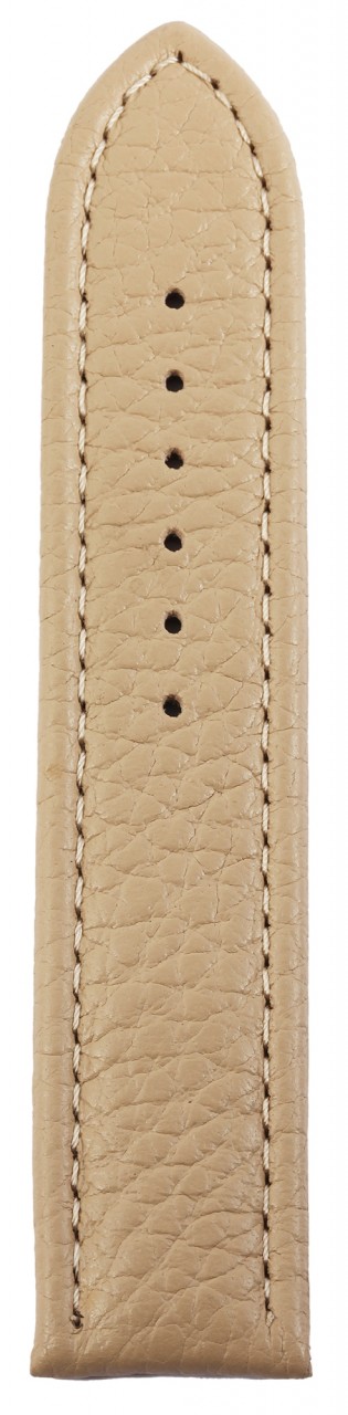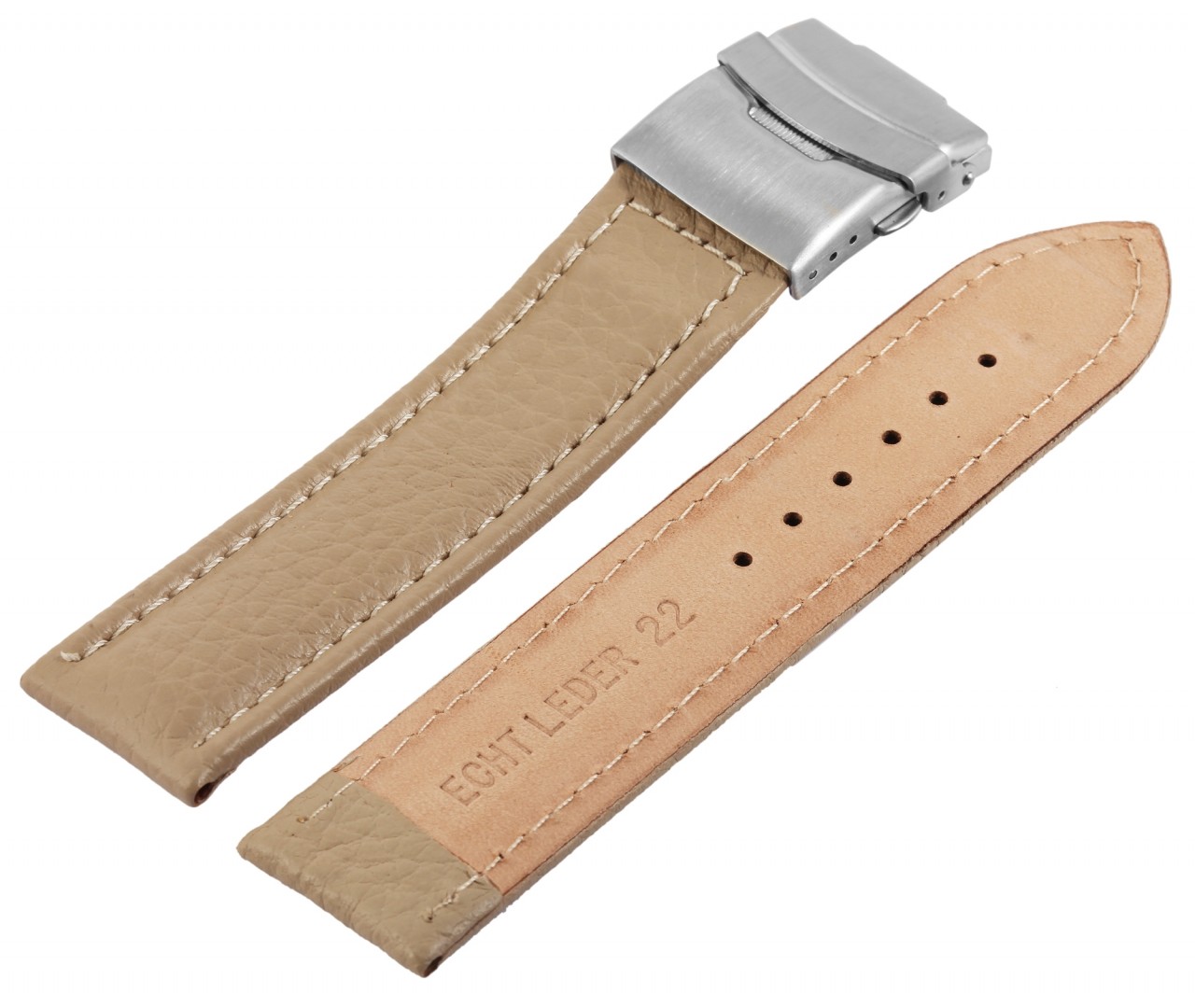 Bracelete bege de reposição em pele genuína. A costura externa tem acabamento na cor correspondente. A parte superior da bracelete é acolchoada. A bracelete possui fecho dobrável em aço inoxidável. A parte do furo afunila até uma ponta no final.
