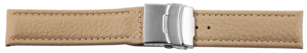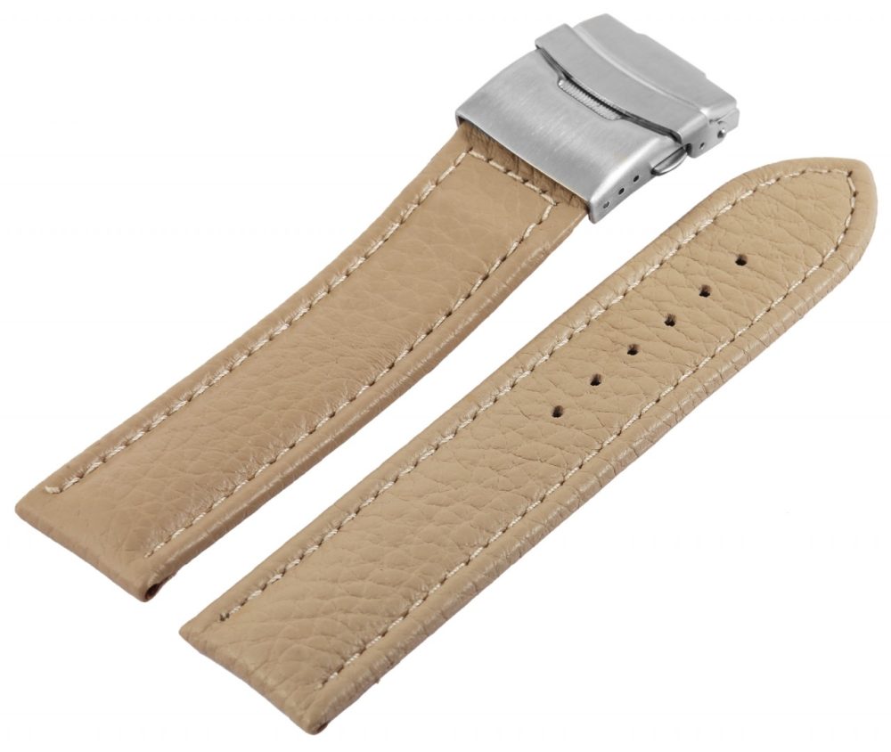 Bracelete bege de reposição em pele genuína. A costura externa tem acabamento na cor correspondente. A parte superior da bracelete é acolchoada. A bracelete possui fecho dobrável em aço inoxidável. A parte do furo afunila até uma ponta no final.