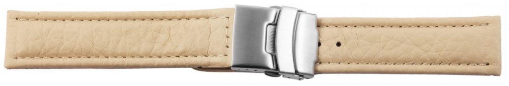 Bracelete bege de reposição em pele genuína.  A costura externa é na mesma cor bege. A parte superior da bracelete é parcialmente acolchoada.  A pulseira possui fecho dobrável em aço inoxidável. A parte do furo afunila até uma ponta no final.