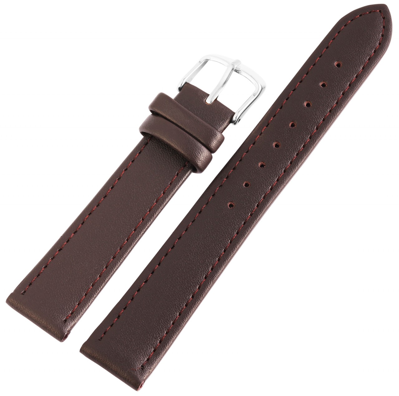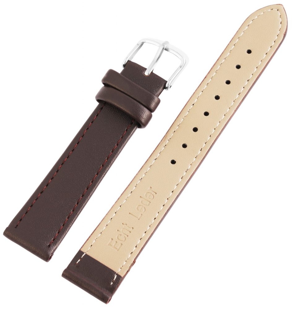 A bracelete de pele genuína castanho escuro está disponível em larguras de 10 mm, 12 mm, 14 mm, 16 mm, 18 mm, 20 mm, 22 mm, 24 mm e 26 mm. Tem uma superfície lisa e acabamento com uma fina costura castanha. A espessura do material é de 3 mm. A pulseira de substituição tem um comprimento total entre 19 cm e 21,5 cm. O comprimento total depende da largura do terminal. A alça do fecho é 2 mm mais estreita que a largura da alça porque a faixa é estreita. A bracelete simples do relógio pode ser aberta e fechada com uma fivela de aço inoxidável prateada.
