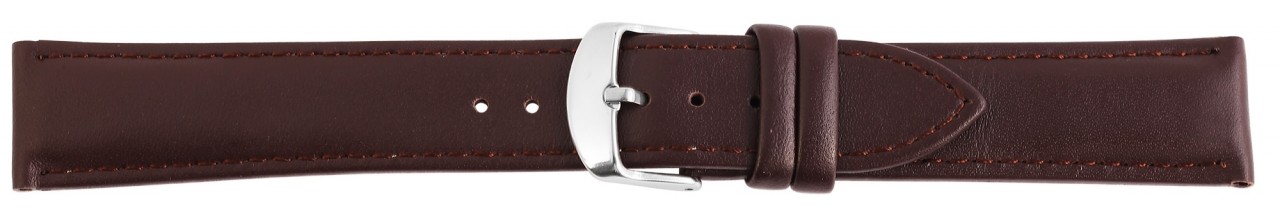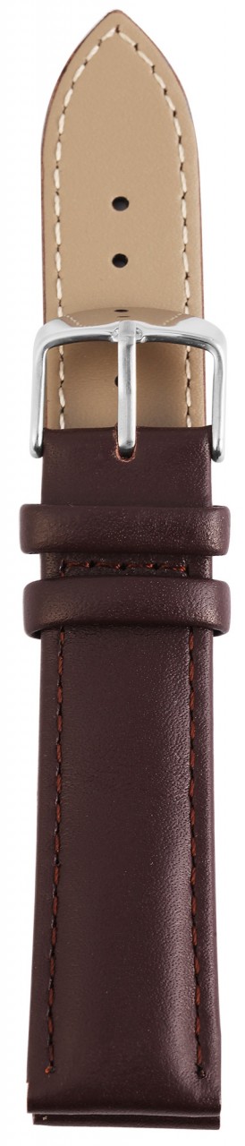 A bracelete castanha de pele genuína está disponível em larguras de 12 mm, 14 mm, 16 mm, 18 mm, 20 mm, 22 mm, 24 mm e 26 mm. A bracelete de pele é levemente acolchoada para ter aproximadamente 5 mm de altura. Tem superfície lisa e costurada com costura castanha na parte externa. O comprimento total da faixa está entre 19,5 cm e 21,5 cm. O comprimento total depende da largura do terminal. A alça do fecho é 2 mm mais estreita que a largura da alça porque a faixa é estreitamente estreita. A bracelete pode ser aberta e fechada com uma fivela prateada.