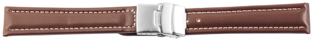 Bracelete clássica de reposição em pele genuína na cor castanha. A costura externa é na cor branca. A parte superior da bracelete é acolchoada. A bracelete possui fecho dobrável em aço inoxidável. A parte do furo afunila até uma ponta no final.