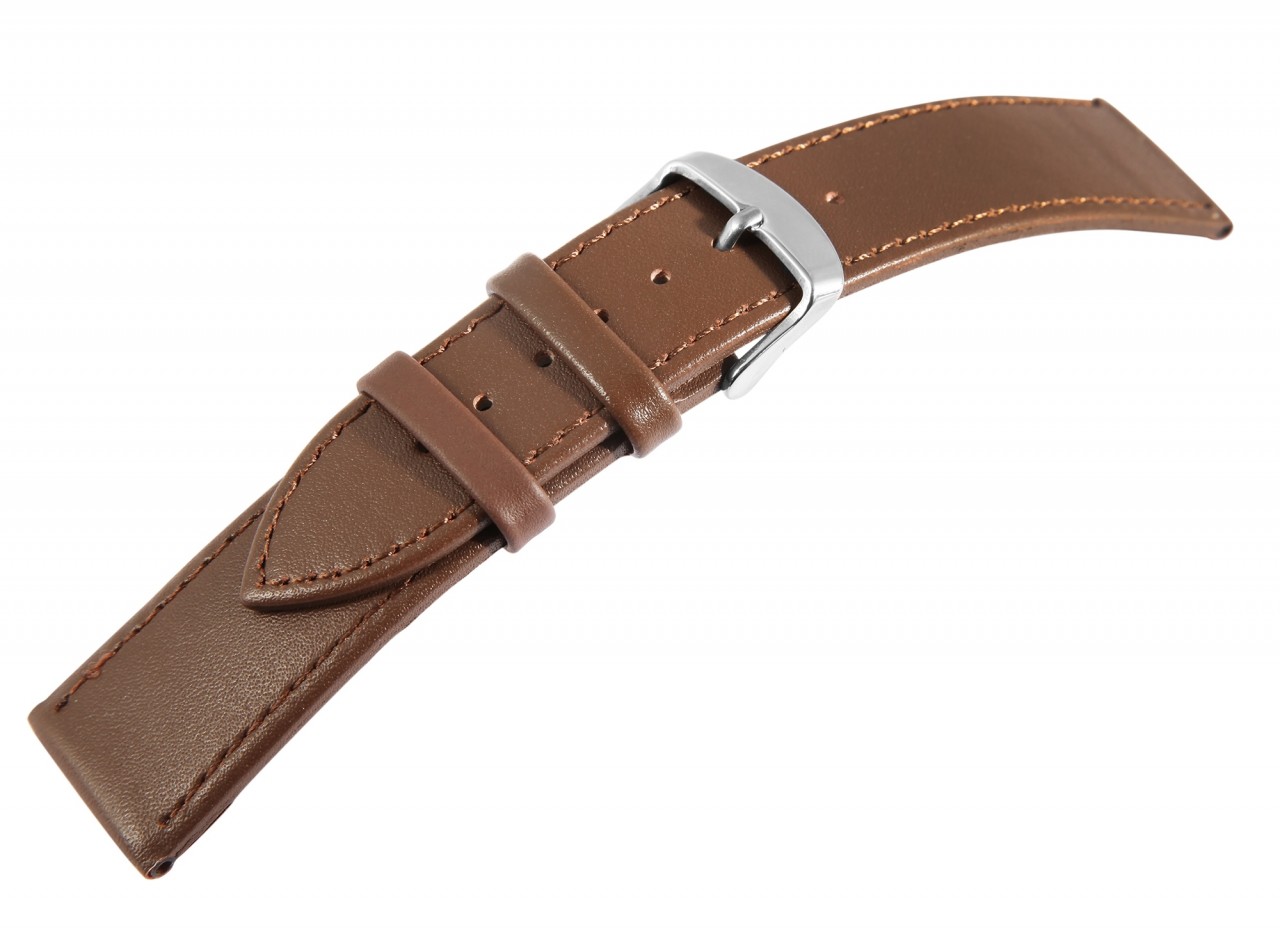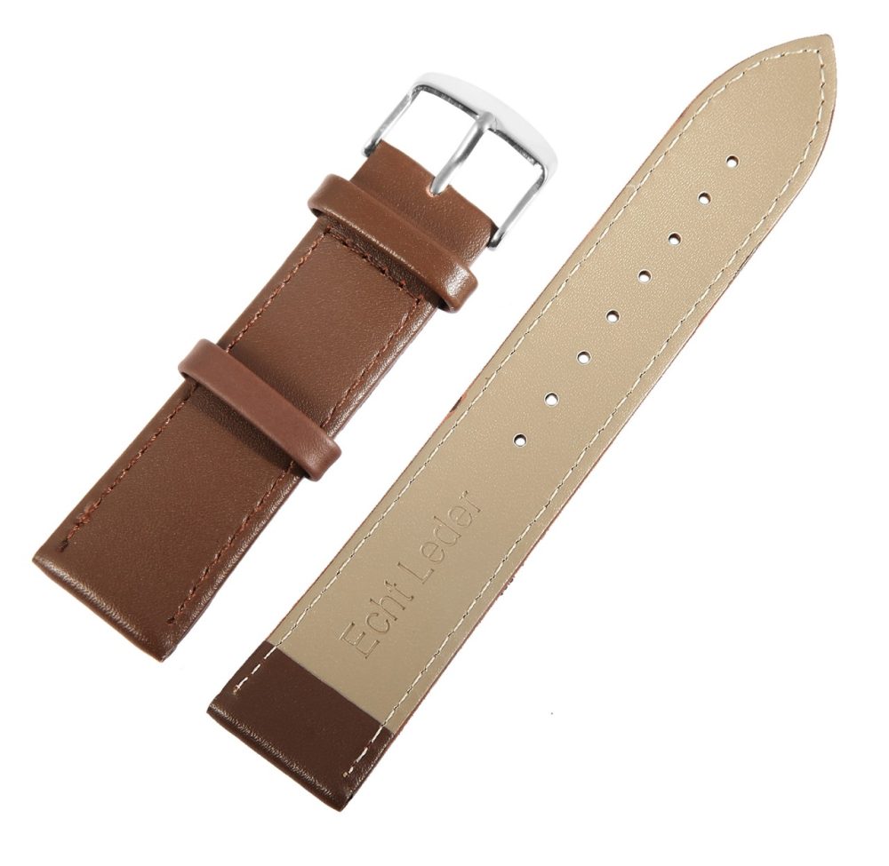 A bracelete castanha de pele genuína está disponível em larguras de 10 mm, 12 mm, 14 mm, 16 mm, 18 mm, 20 mm, 22 mm, 24 mm e 26 mm. Tem uma superfície lisa e acabamento com uma fina costura castanha. A espessura do material é de 3 mm. A bracelete de substituição tem um comprimento total entre 19 cm e 21,5 cm. O comprimento total depende da largura do terminal. A alça do fecho é 2 mm mais estreita que a largura da alça porque a faixa é estreita. Pode ser aberto e fechado com uma fivela prateada.