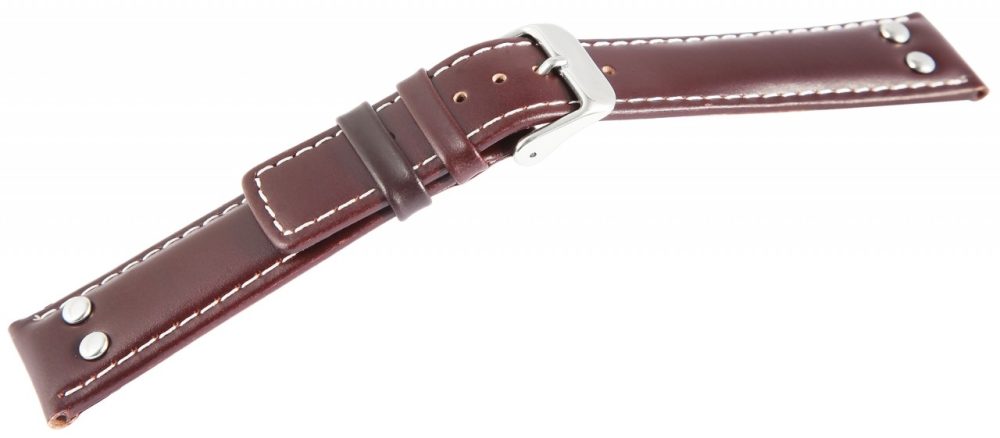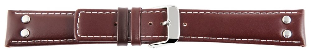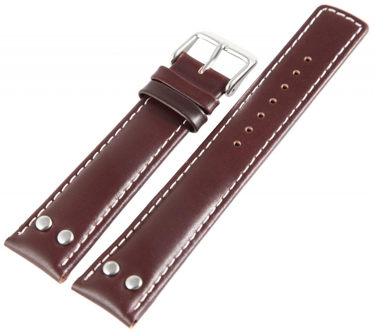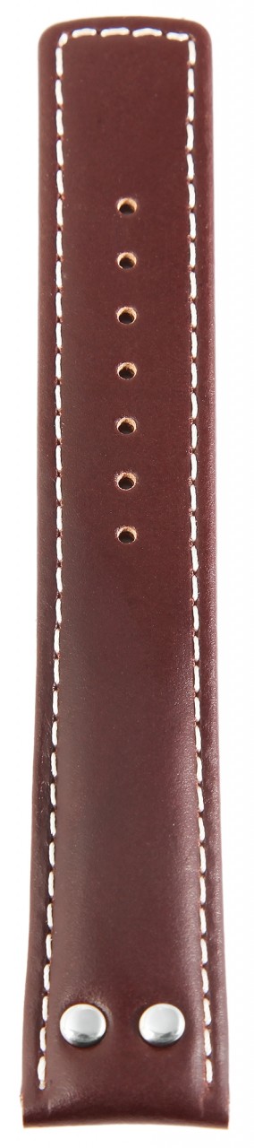 Bracelete clássica de substituição em pele genuína na cor castanho. A costura externa é na cor branca. Possui uma fivela de pino de aço inoxidável prateado. A parte do furo afunila até uma ponta no final.