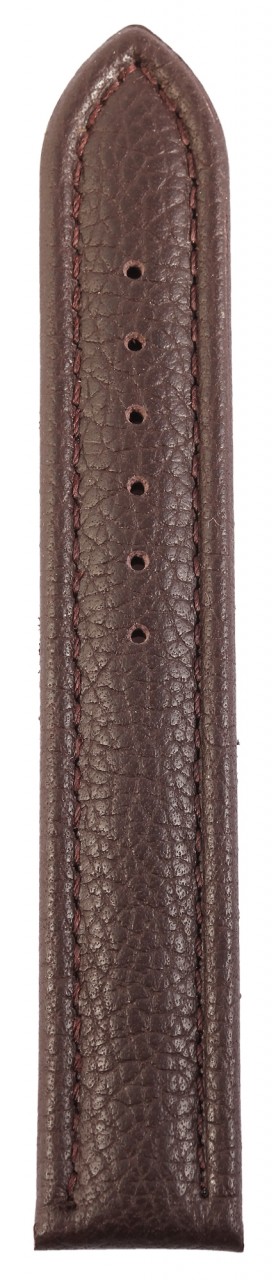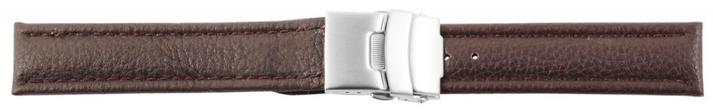 Bracelete clássica de substituição em pele genuína na cor castanho escuro em pele genuína. A costura externa é na cor castanha. A parte superior da bracelete é acolchoada. A bracelete possui fecho dobrável em aço inoxidável. A parte do furo afunila até uma ponta no final.