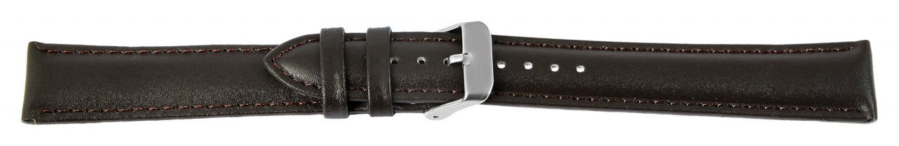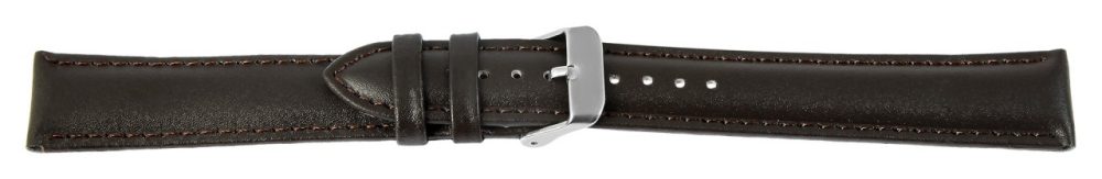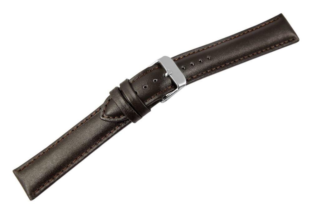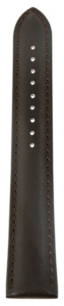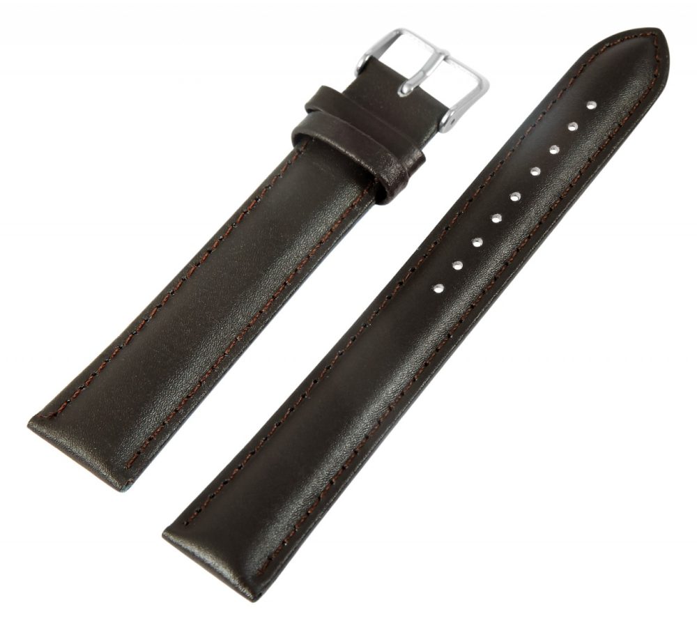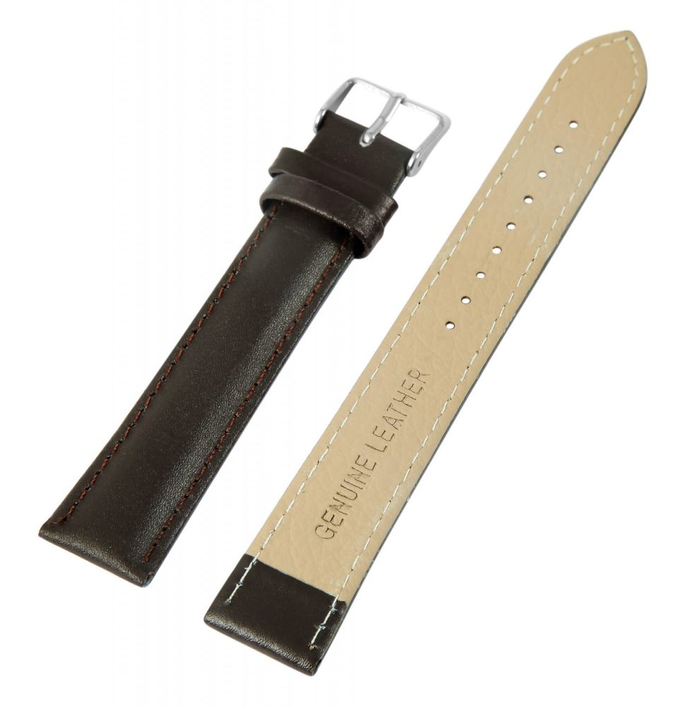 Bracelete de reposição em couro legítimo na cor castanho escuro. A costura externa é do mesmo castanho escuro. A bracelete é granulada e acolchoada. Foi feito de couro de bezerro. A bracelete tem uma fivela de alfinete e duas presilhas. A parte do furo fica plana na extremidade.