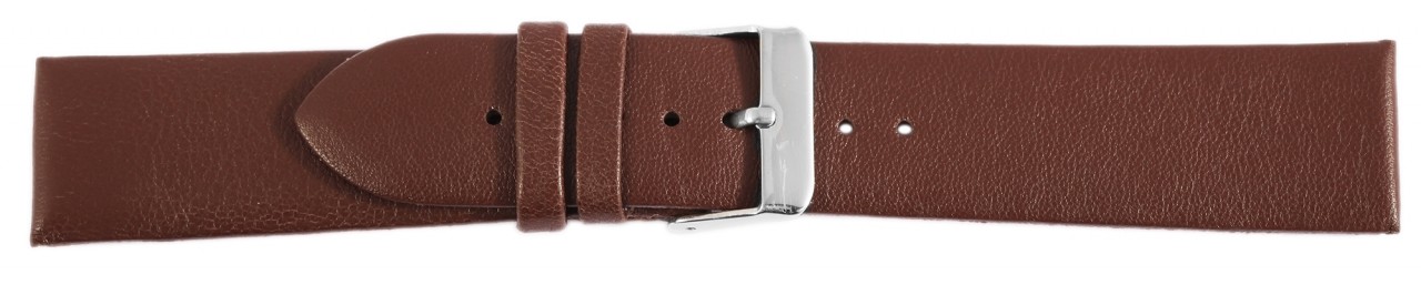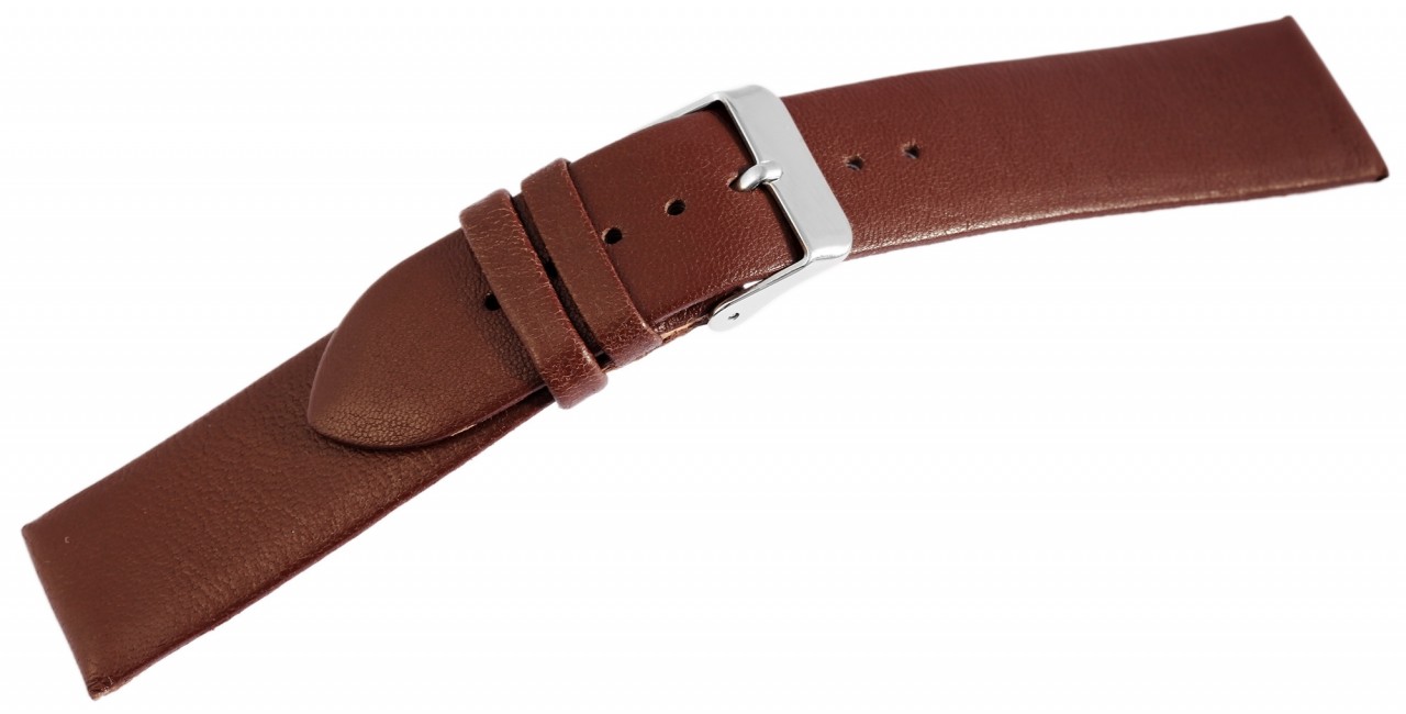A bracelete castanha do relógio é feita de pele genuína e está disponível em larguras de 12 mm, 14 mm, 16 mm, 18 mm, 20 mm e 22 mm. A alça do fecho é 2 mm mais estreita que a largura da alça porque a faixa fica mais estreita ali. Somente com uma largura de 14 mm a lingueta do fecho e a largura da lingueta têm a mesma largura. O comprimento total da banda é de 20 cm e a espessura do material é de 2,5 mm. A bracelete de substituição pode ser aberta e fechada com uma fivela prateada altamente polida. O acabamento brilhante em combinação com a bracelete de pele lisa sublinha o belo design da pulseira do relógio e garante uma colocação e retirada rápida e fácil.