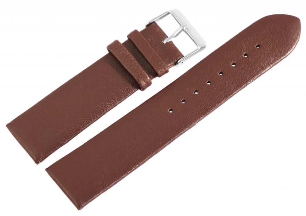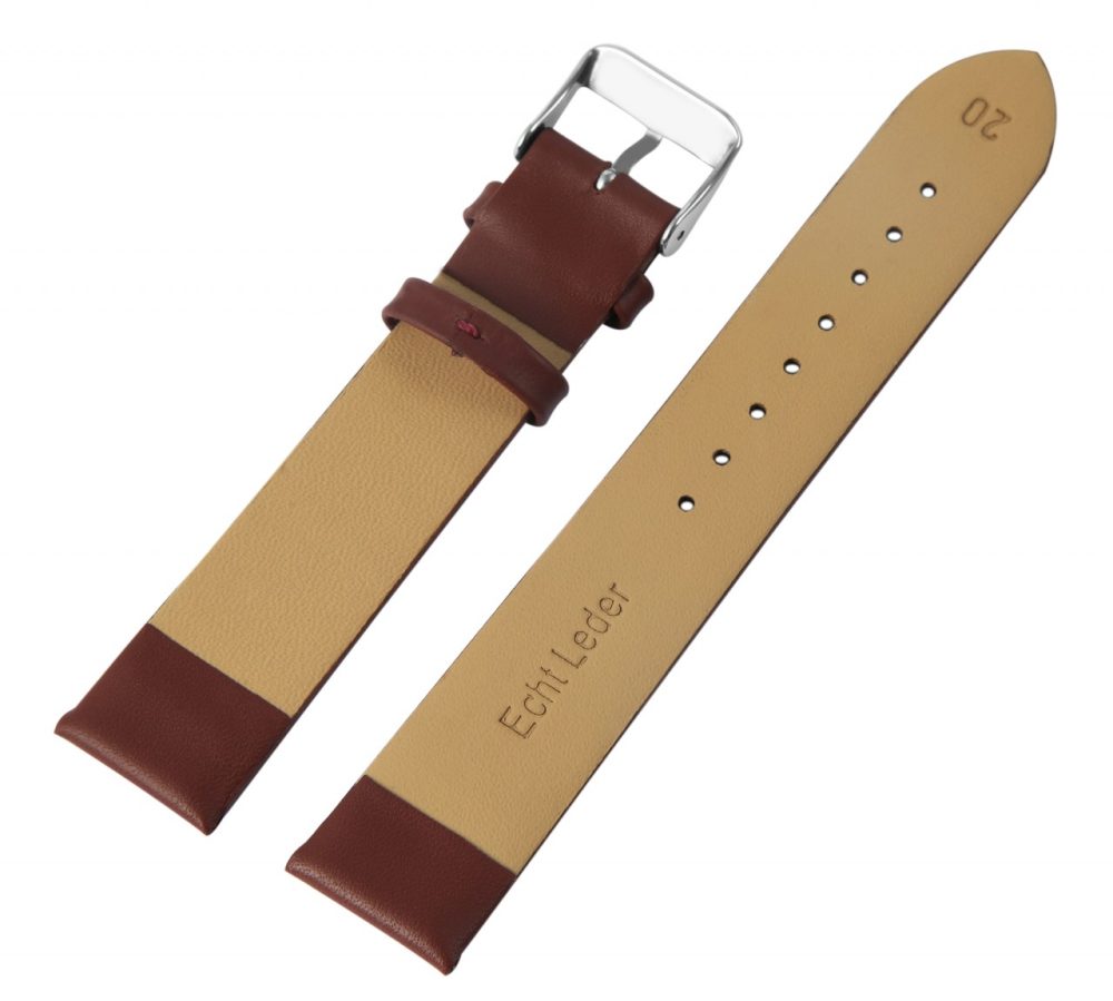 A bracelete castanha do relógio é feita de pele genuína e está disponível em larguras de 12 mm, 14 mm, 16 mm, 18 mm, 20 mm e 22 mm. A alça do fecho é 2 mm mais estreita que a largura da alça porque a faixa fica mais estreita ali. Somente com uma largura de 14 mm a lingueta do fecho e a largura da lingueta têm a mesma largura. O comprimento total da banda é de 20 cm e a espessura do material é de 2,5 mm. A bracelete de substituição pode ser aberta e fechada com uma fivela prateada altamente polida. O acabamento brilhante em combinação com a bracelete de pele lisa sublinha o belo design da pulseira do relógio e garante uma colocação e retirada rápida e fácil.