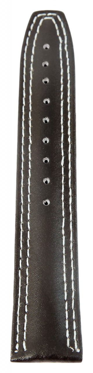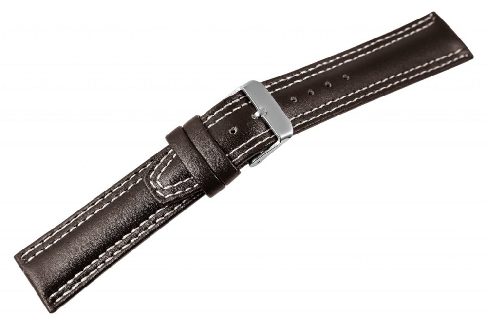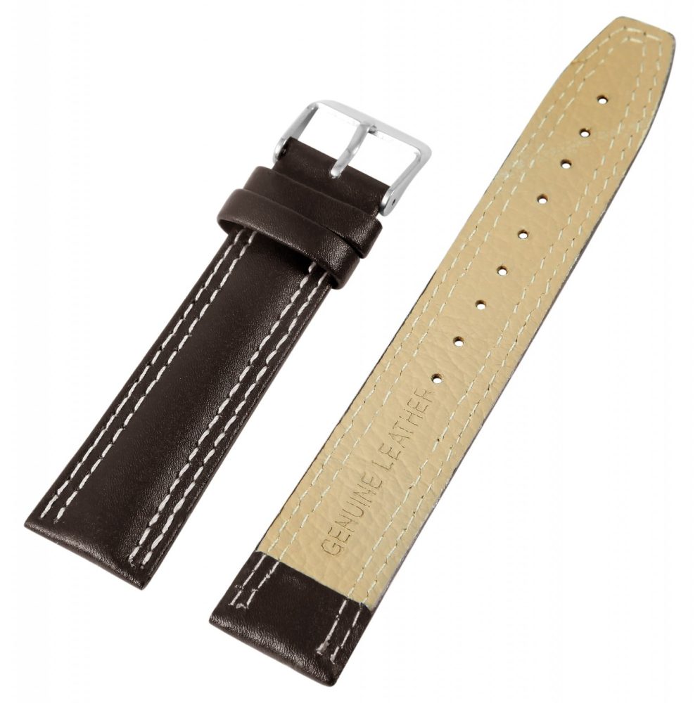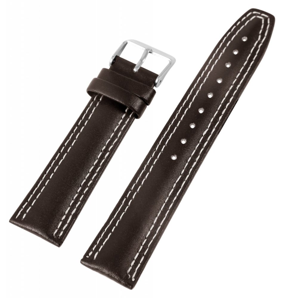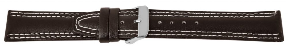 Bracelete de reposição em pele genuína na cor castanho escuro. A costura externa é dupla na cor branca. A bracelete é granulada e acolchoada. Foi feito de couro de bezerro. A bracelete tem uma fivela de alfinete e duas presilhas. A parte do furo afunila até uma ponta no final.