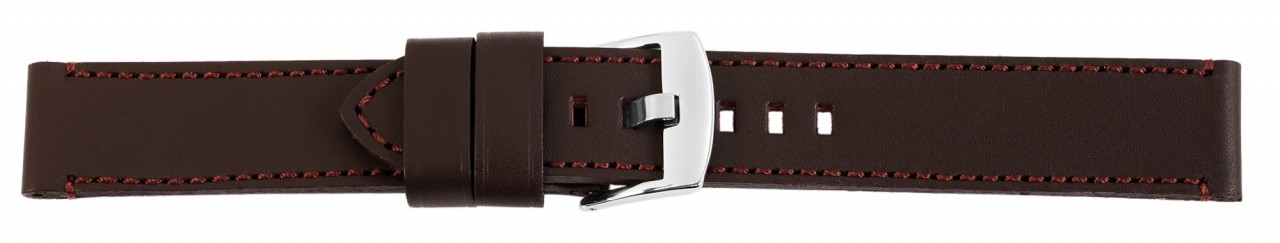 Bracelete básica de pele genuína em castanho escuro com costura castanha. A bracelete tem uma fivela prateada e duas presilhas. A parte do furo afunila até uma ponta no final. A bracelete é do tamanho XL e, portanto, é adequada para pulsos maiores.