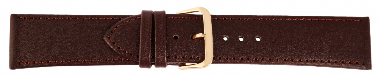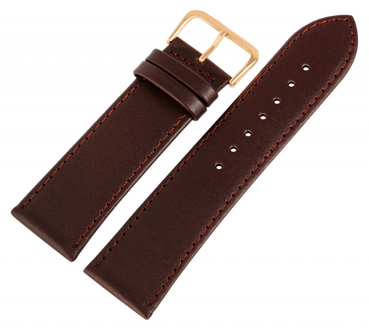A bracelete de cor castanho feita de pele genuína está disponível em larguras de 18 mm, 20 mm, 22 mm e 24 mm. Tem uma superfície lisa e acabamento com uma fina costura castanha escura. A pulseira de reposição tem comprimento total de 20 cm e espessura de material de 2 mm. A alça do fecho é 2 mm mais estreita que a largura da alça porque a faixa é estreitamente estreita. A pulseira simples do relógio pode ser aberta e fechada com uma fivela dourada.
