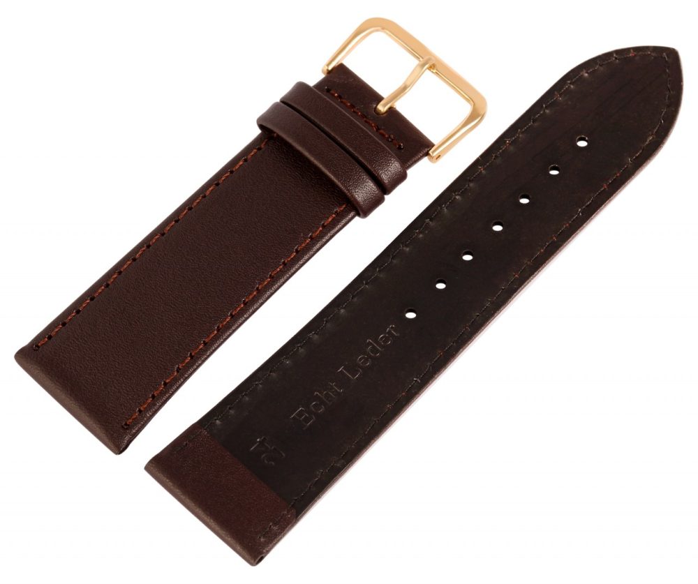 A bracelete de cor castanho feita de pele genuína está disponível em larguras de 18 mm, 20 mm, 22 mm e 24 mm. Tem uma superfície lisa e acabamento com uma fina costura castanha escura. A pulseira de reposição tem comprimento total de 20 cm e espessura de material de 2 mm. A alça do fecho é 2 mm mais estreita que a largura da alça porque a faixa é estreitamente estreita. A pulseira simples do relógio pode ser aberta e fechada com uma fivela dourada.